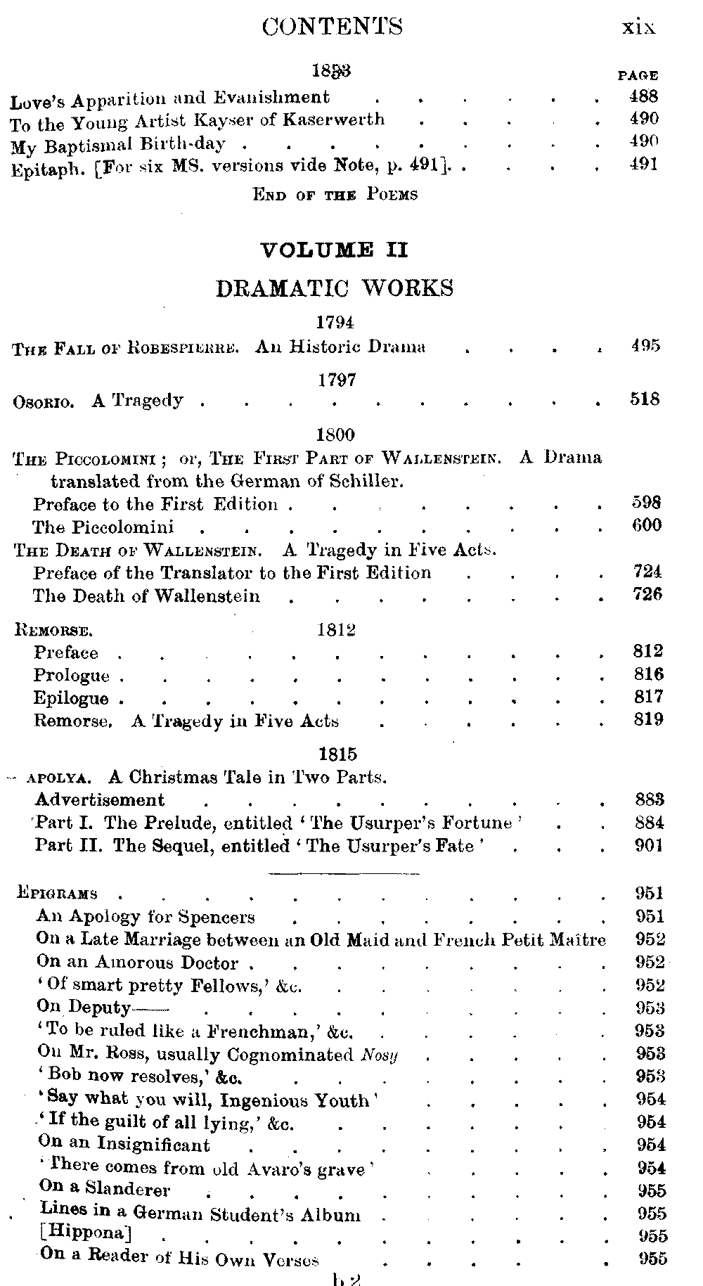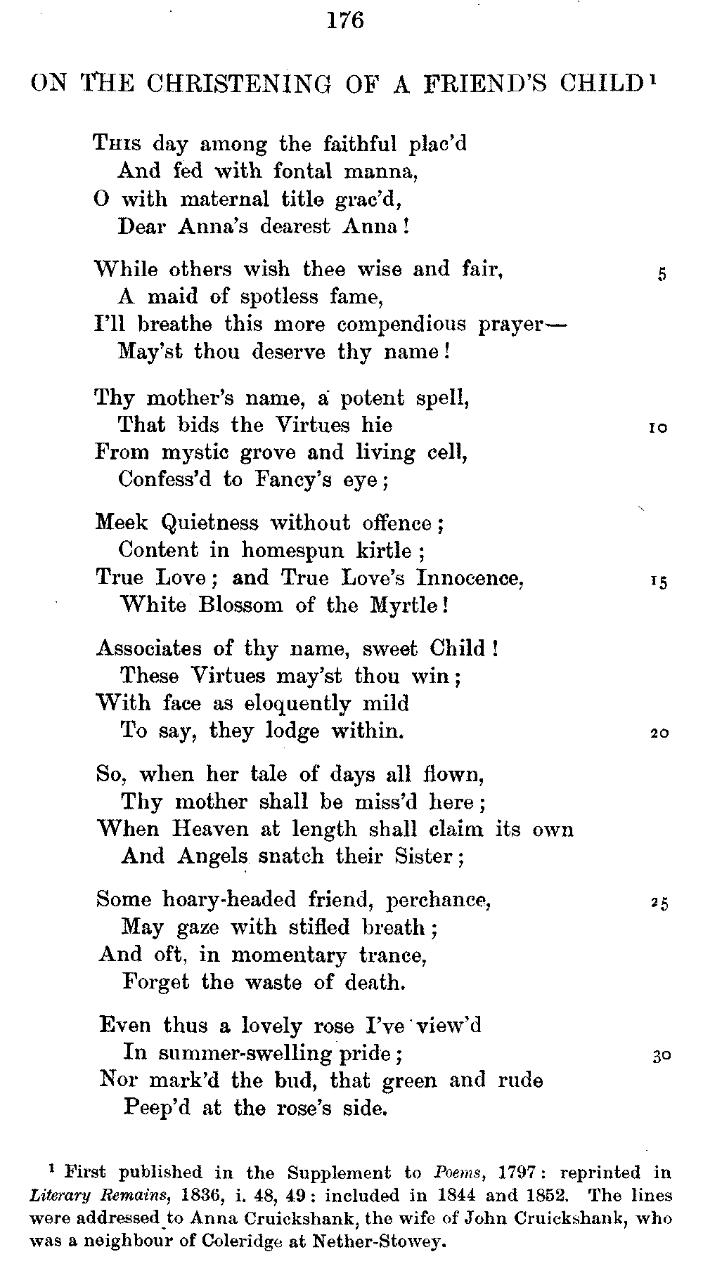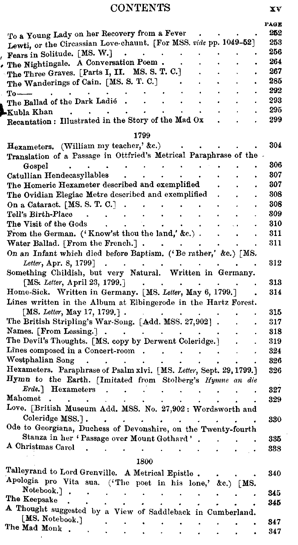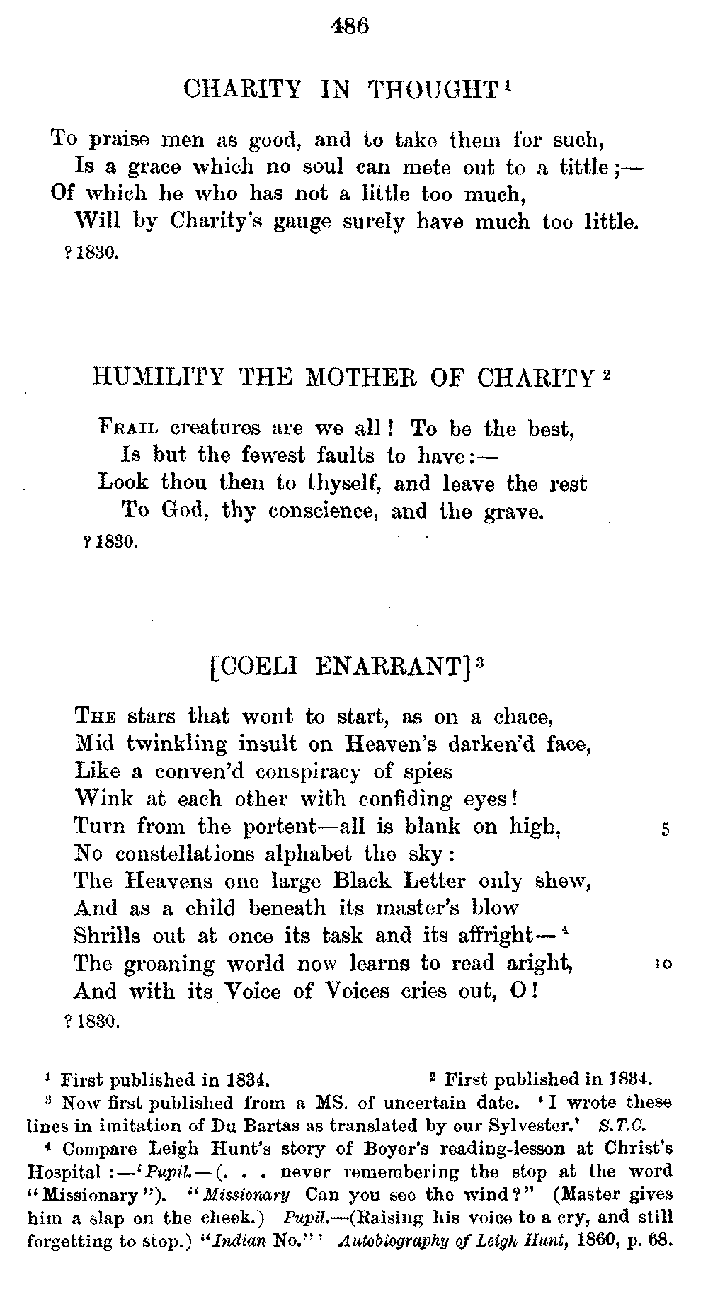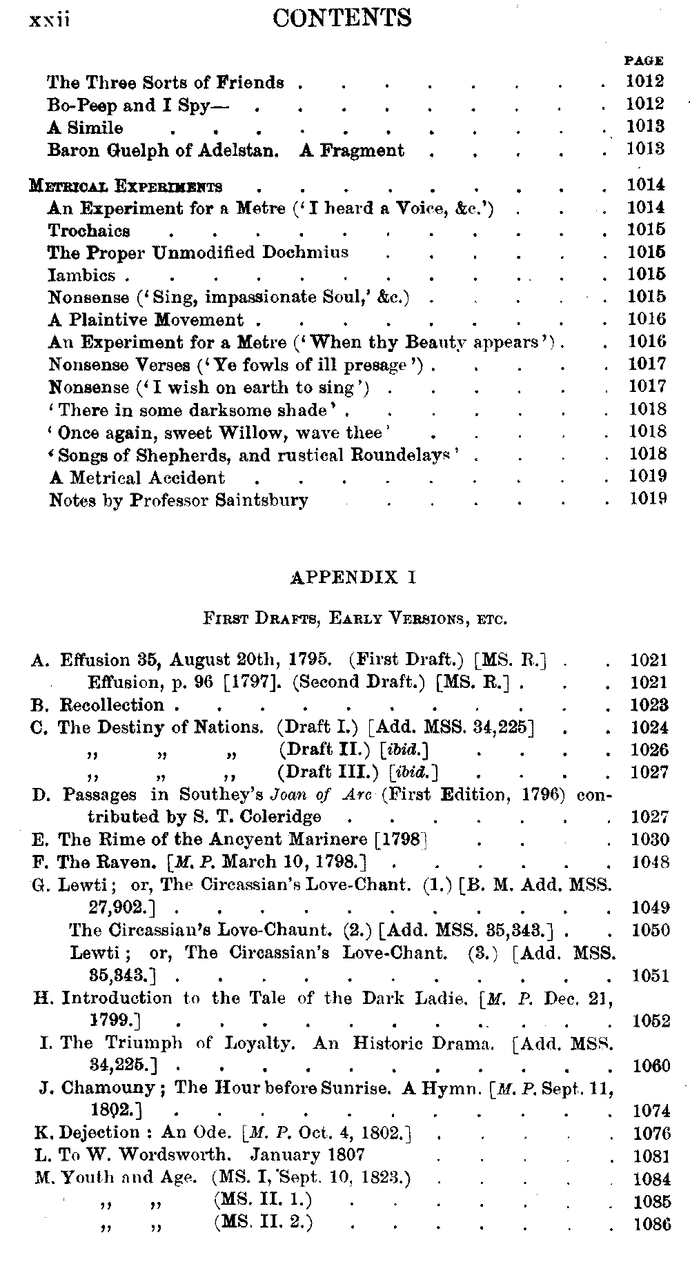 The poems have been printed, as far as possible, in chronological order, but when no MS. is extant, or when the MS. authority is a first draft embodied in a notebook, the exact date can only be arrived at by a balance of probabilities. The present edition includes all poems and fragments published for the first time in 1893. Many of these were excerpts from the Notebooks, collected, transcribed, and dated by myself. Some of the fragments (vide post, p. 996, n. 1) I have since discovered are not original compositions, but were selected passages from elder poets—amongst them Cartwright's lines, entitled 'The Second Birth', which are printed on p. 362 of the text; but for their insertion in the edition of 1893, for a few misreadings of the MSS., and for their approximate date, I was mainly responsible.