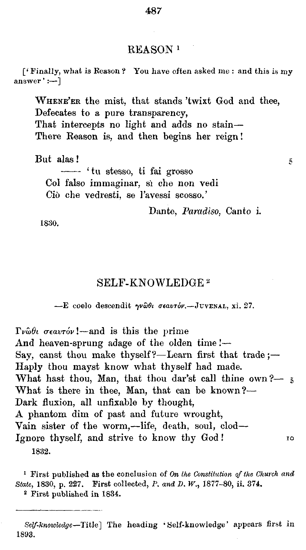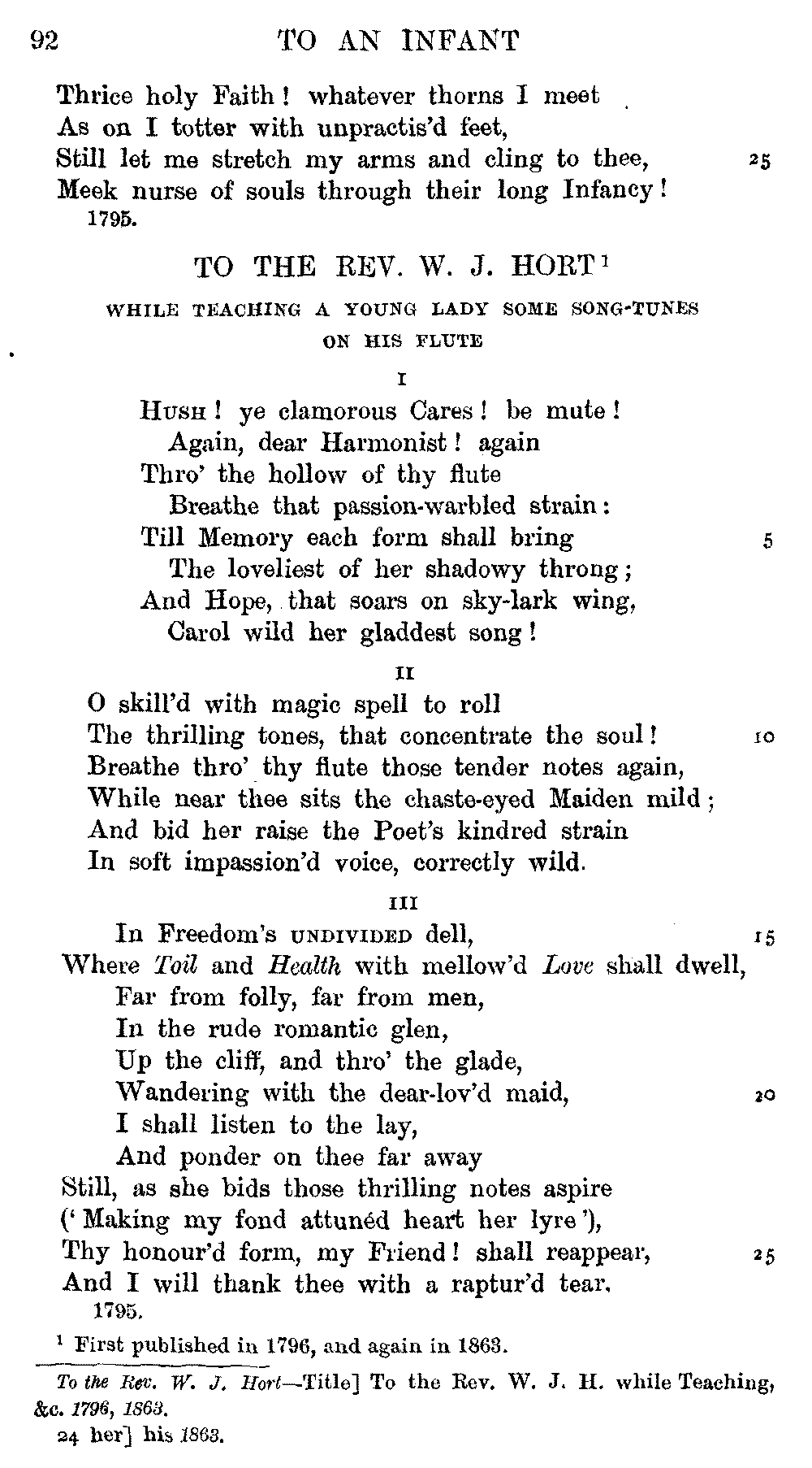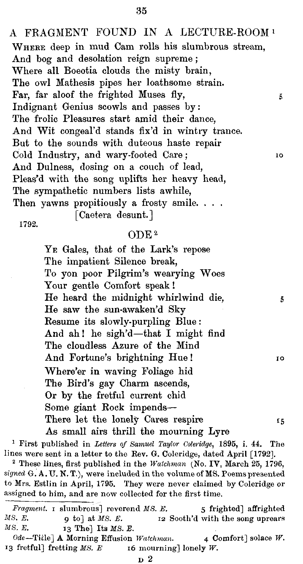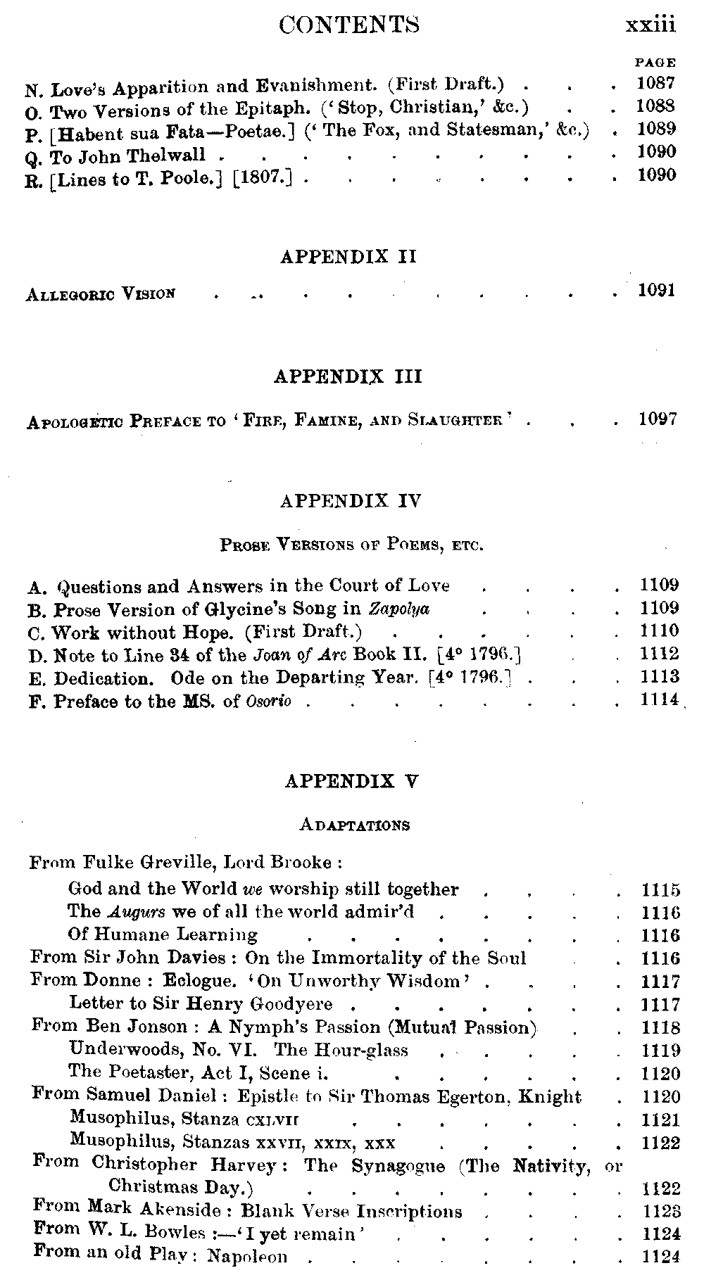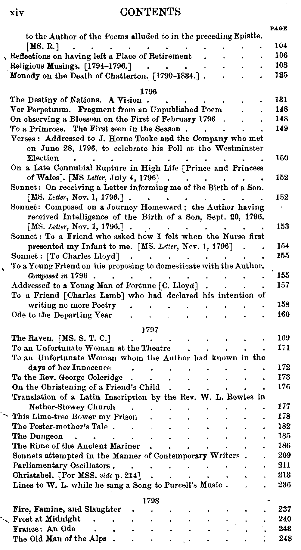 The poems have been printed, as far as possible, in chronological order, but when no MS. is extant, or when the MS. authority is a first draft embodied in a notebook, the exact date can only be arrived at by a balance of probabilities. The present edition includes all poems and fragments published for the first time in 1893. Many of these were excerpts from the Notebooks, collected, transcribed, and dated by myself. Some of the fragments (vide post, p. 996, n. 1) I have since discovered are not original compositions, but were selected passages from elder poets—amongst them Cartwright's lines, entitled 'The Second Birth', which are printed on p. 362 of the text; but for their insertion in the edition of 1893, for a few misreadings of the MSS., and for their approximate date, I was mainly responsible.