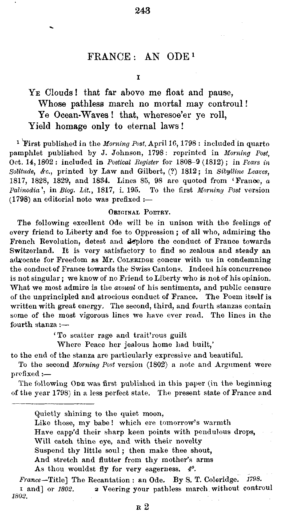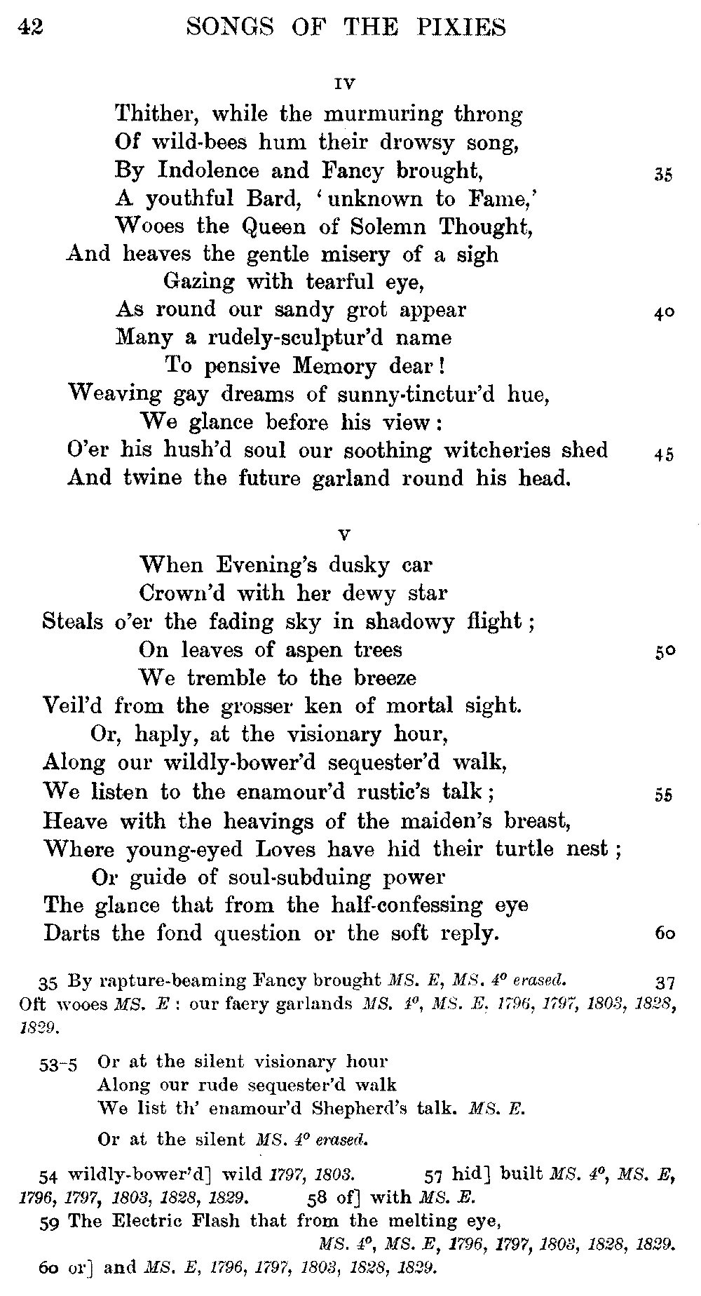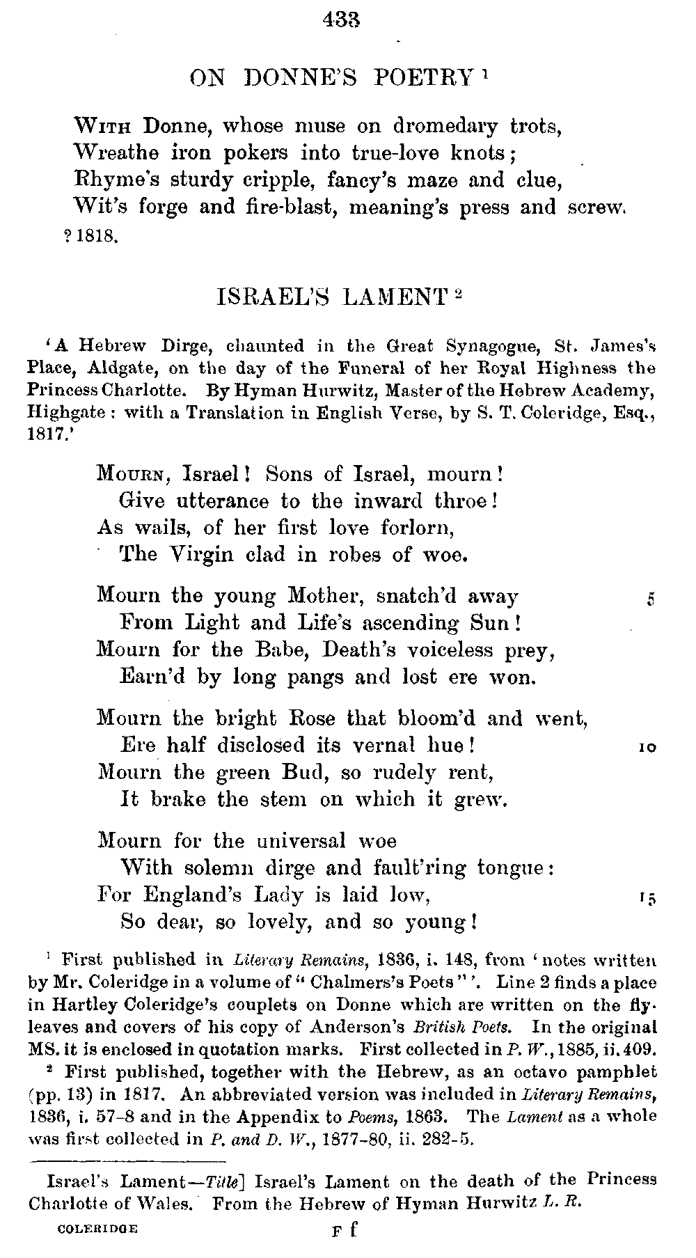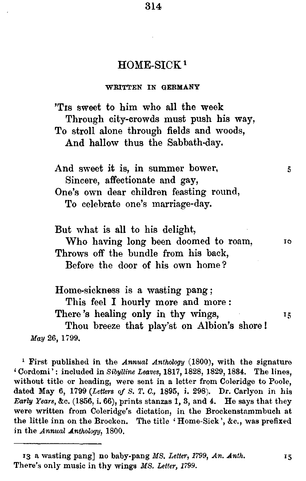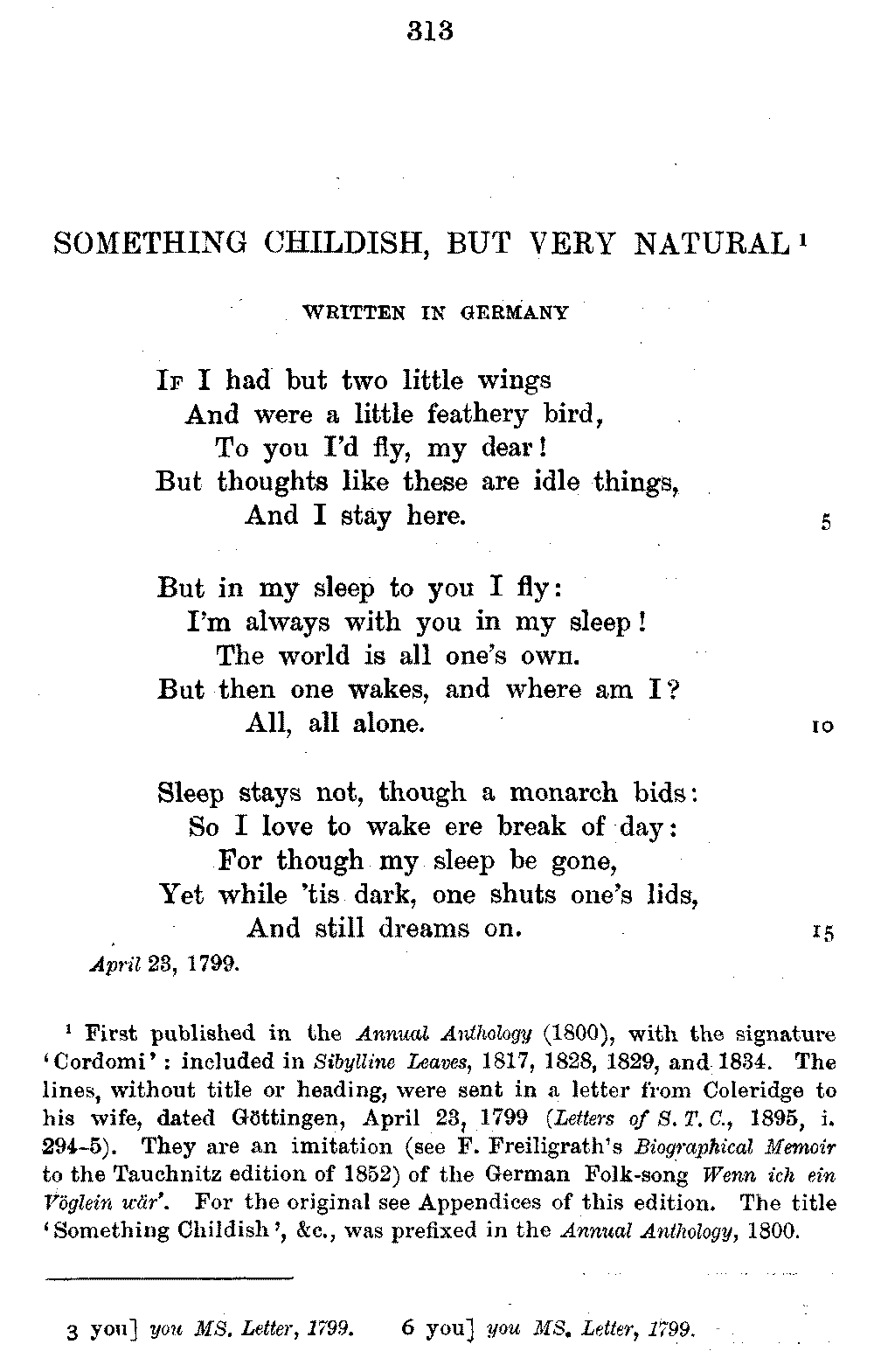 The poems have been printed, as far as possible, in chronological order, but when no MS. is extant, or when the MS. authority is a first draft embodied in a notebook, the exact date can only be arrived at by a balance of probabilities. The present edition includes all poems and fragments published for the first time in 1893. Many of these were excerpts from the Notebooks, collected, transcribed, and dated by myself. Some of the fragments (vide post, p. 996, n. 1) I have since discovered are not original compositions, but were selected passages from elder poets—amongst them Cartwright's lines, entitled 'The Second Birth', which are printed on p. 362 of the text; but for their insertion in the edition of 1893, for a few misreadings of the MSS., and for their approximate date, I was mainly responsible.