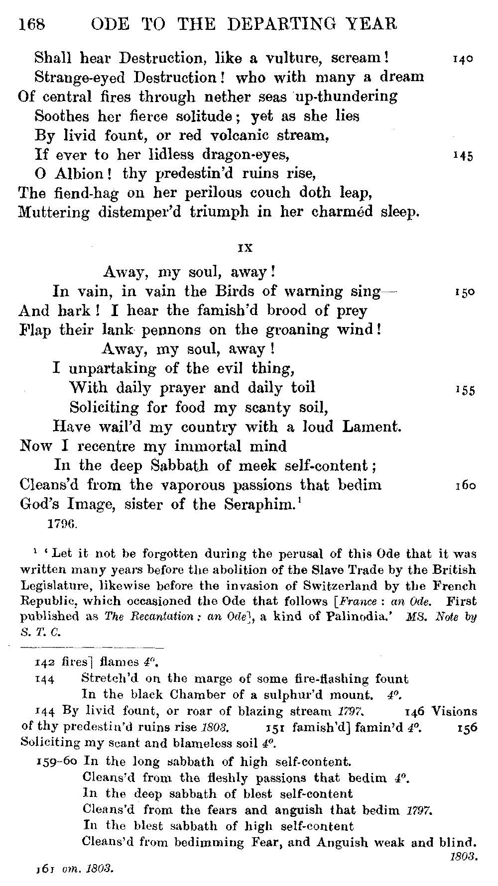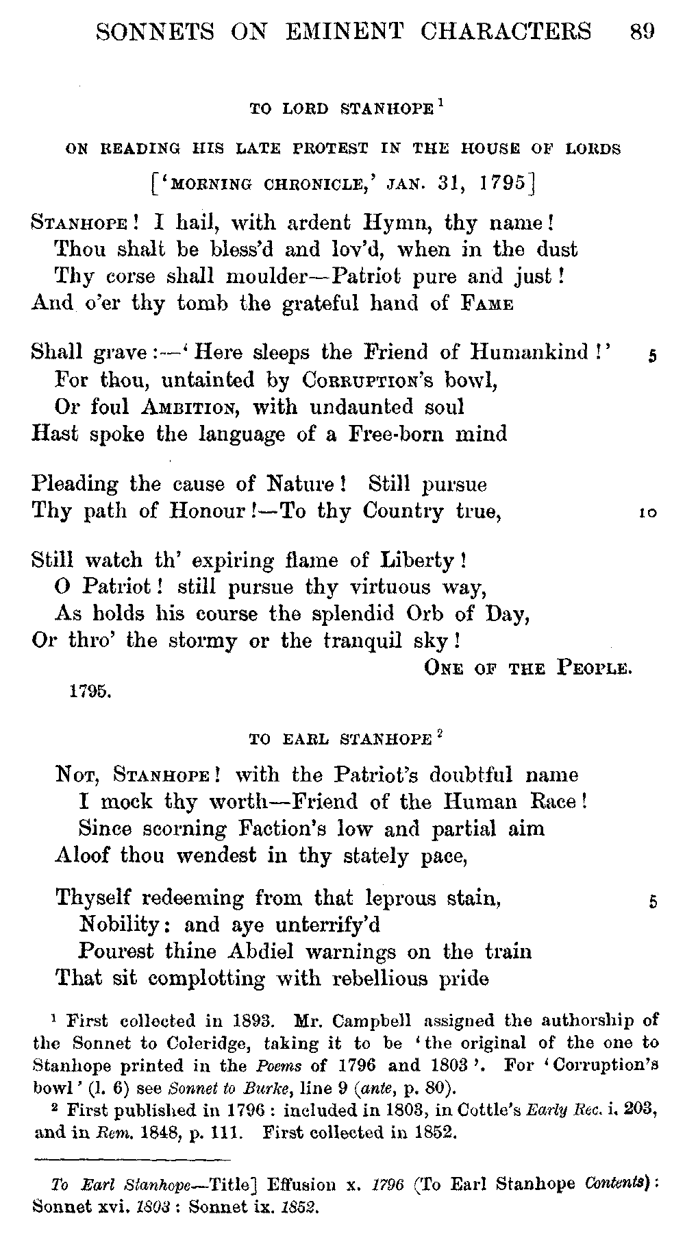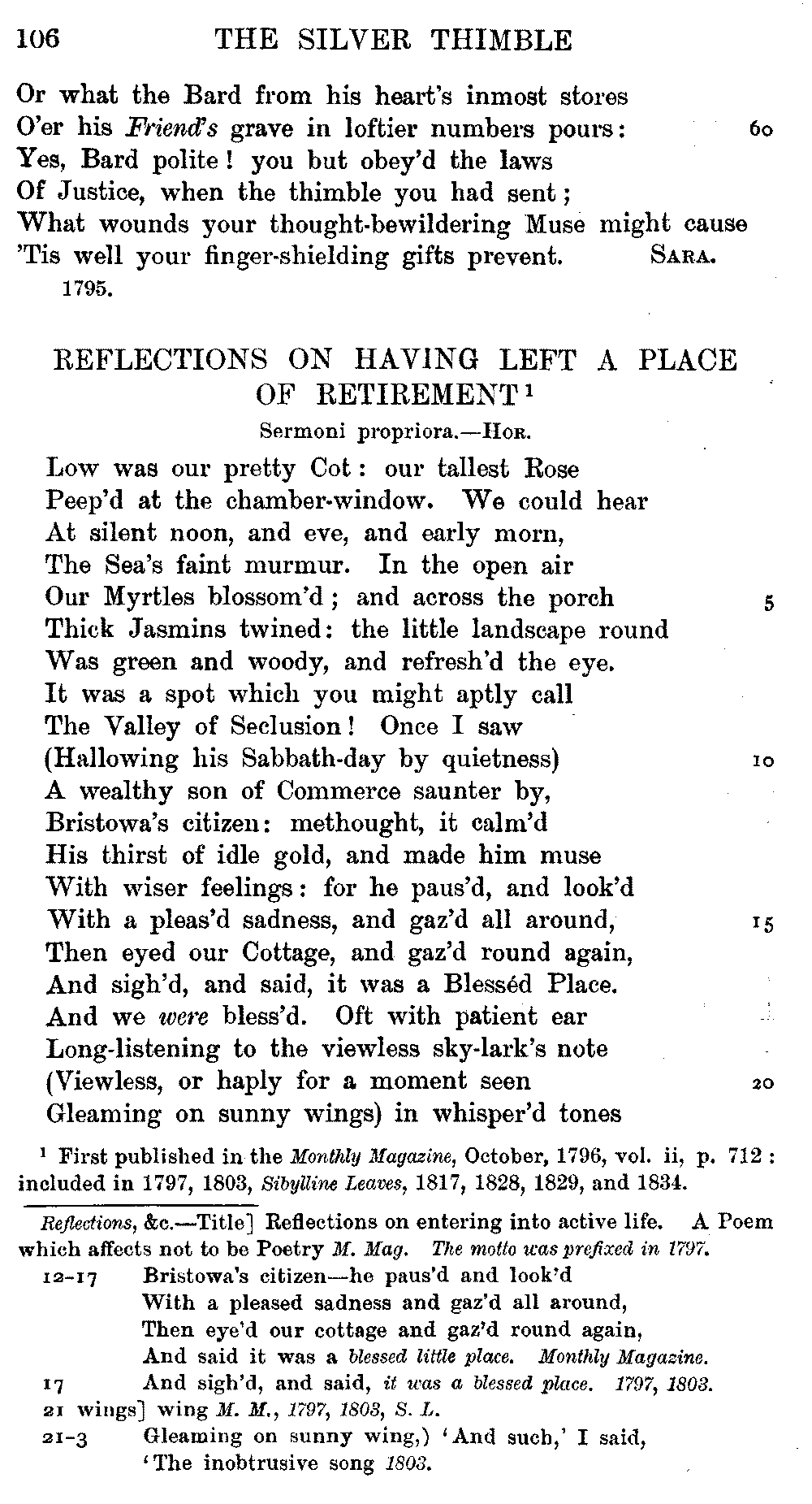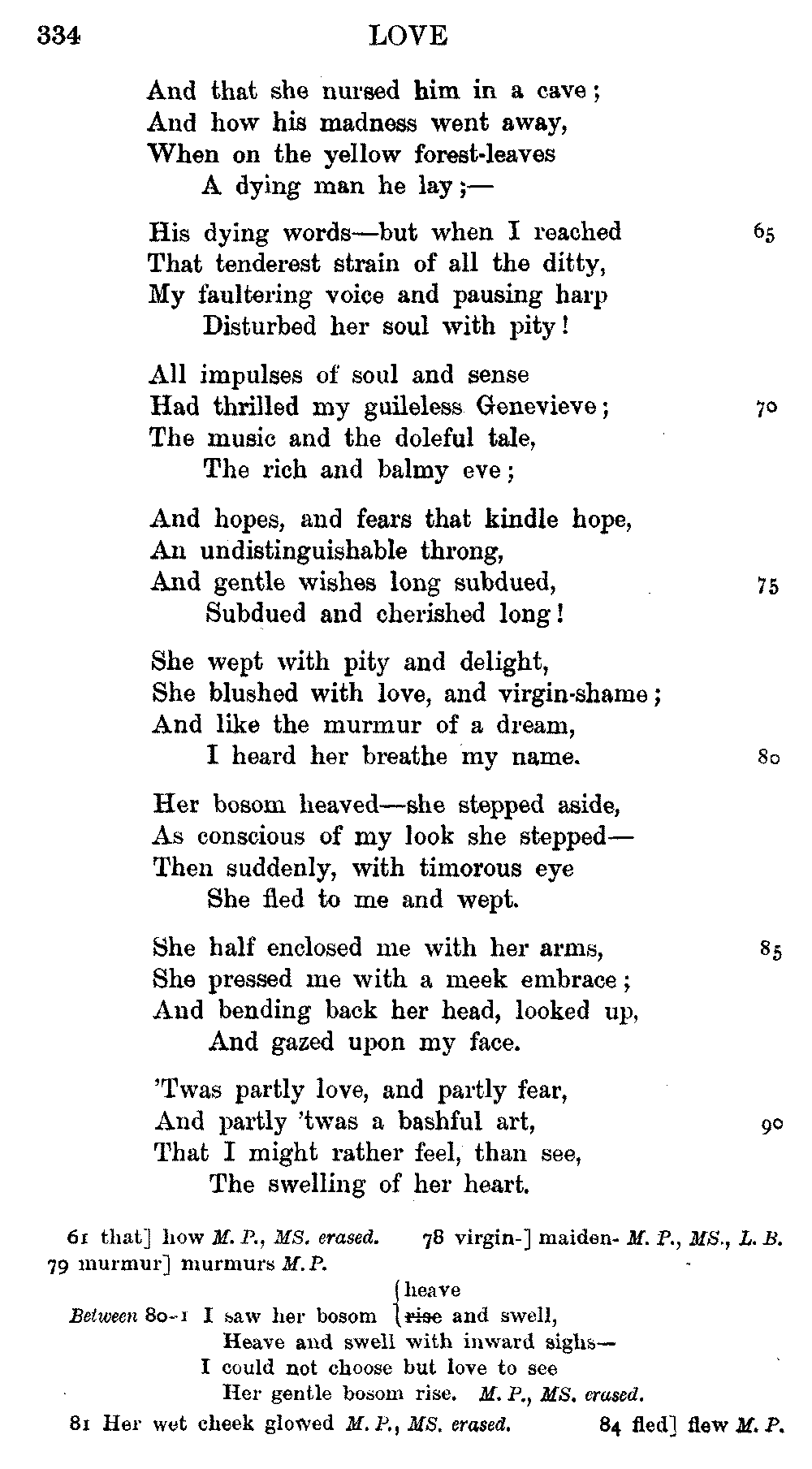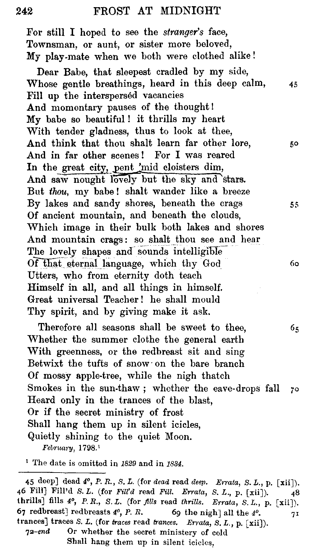 The poems have been printed, as far as possible, in chronological order, but when no MS. is extant, or when the MS. authority is a first draft embodied in a notebook, the exact date can only be arrived at by a balance of probabilities. The present edition includes all poems and fragments published for the first time in 1893. Many of these were excerpts from the Notebooks, collected, transcribed, and dated by myself. Some of the fragments (vide post, p. 996, n. 1) I have since discovered are not original compositions, but were selected passages from elder poets—amongst them Cartwright's lines, entitled 'The Second Birth', which are printed on p. 362 of the text; but for their insertion in the edition of 1893, for a few misreadings of the MSS., and for their approximate date, I was mainly responsible.