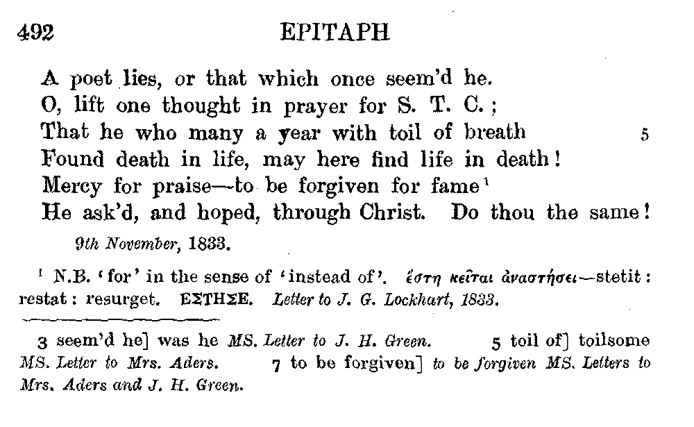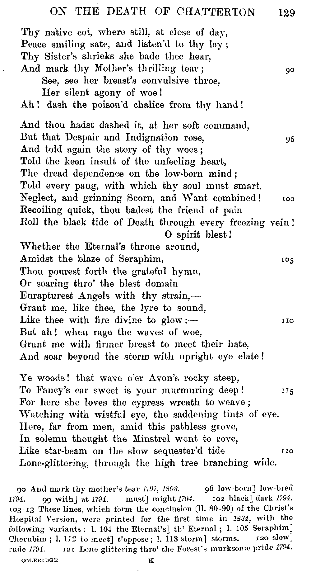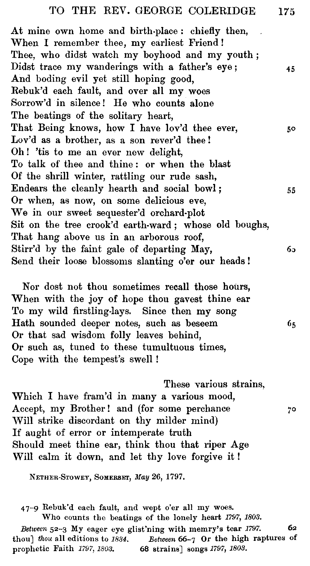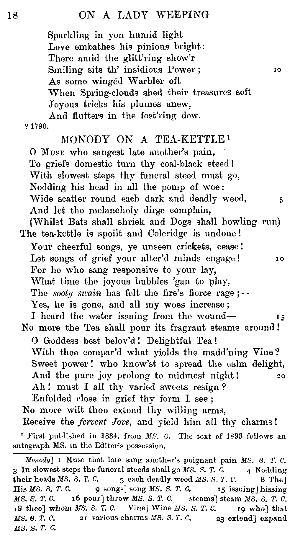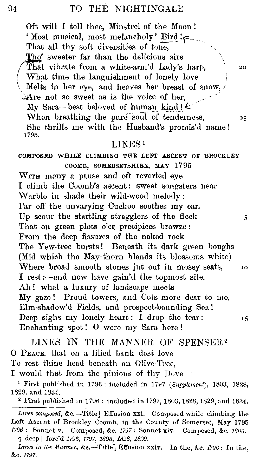 My plea is that it is difficult if not impossible to draw a line above which a variant is important and below which it is negligible; that, to use a word of the poet's own coining, his emendations are rarely if ever 'lightheartednesses'; and that if a collation of the printed text with MSS. is worth studying at all the one must be as decipherable as the other. Facsimiles are rare and costly productions, and an exhaustive table of variants is the nearest approach to a substitute. Many, I know, are the shortcomings, too many, I fear, are the errors in the footnotes to this volume, but now, for the first time, the MSS. of Coleridge's poems which are known to be extant are in a manner reproduced and made available for study and research.