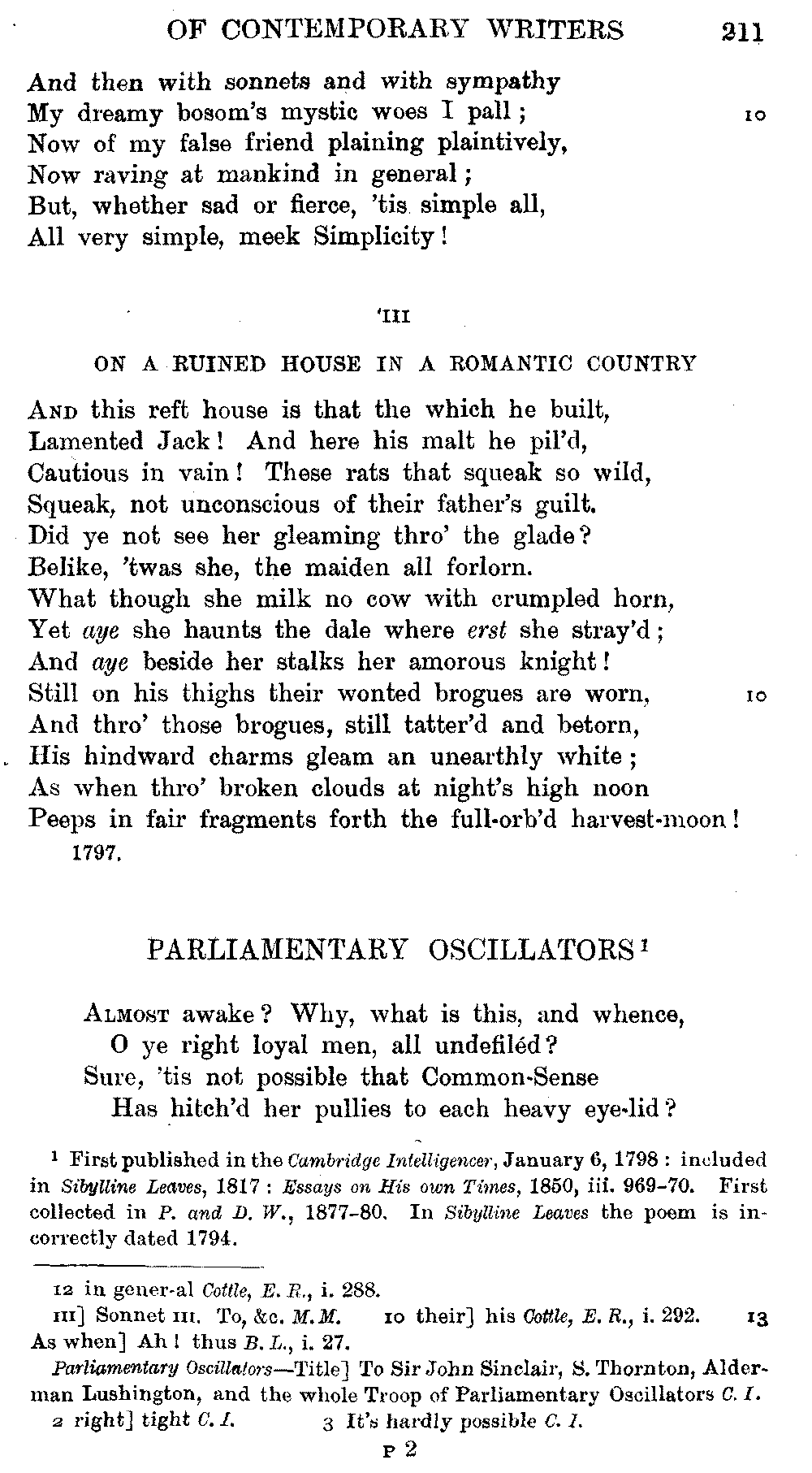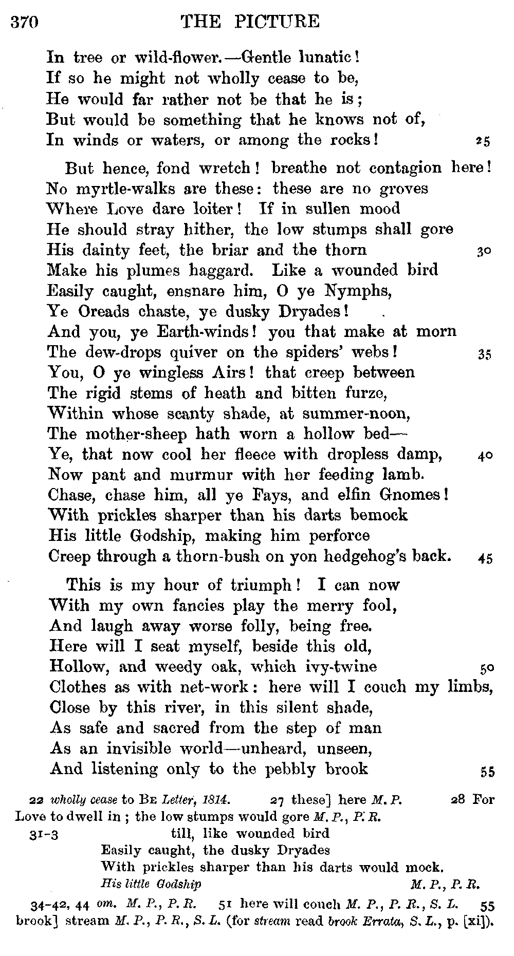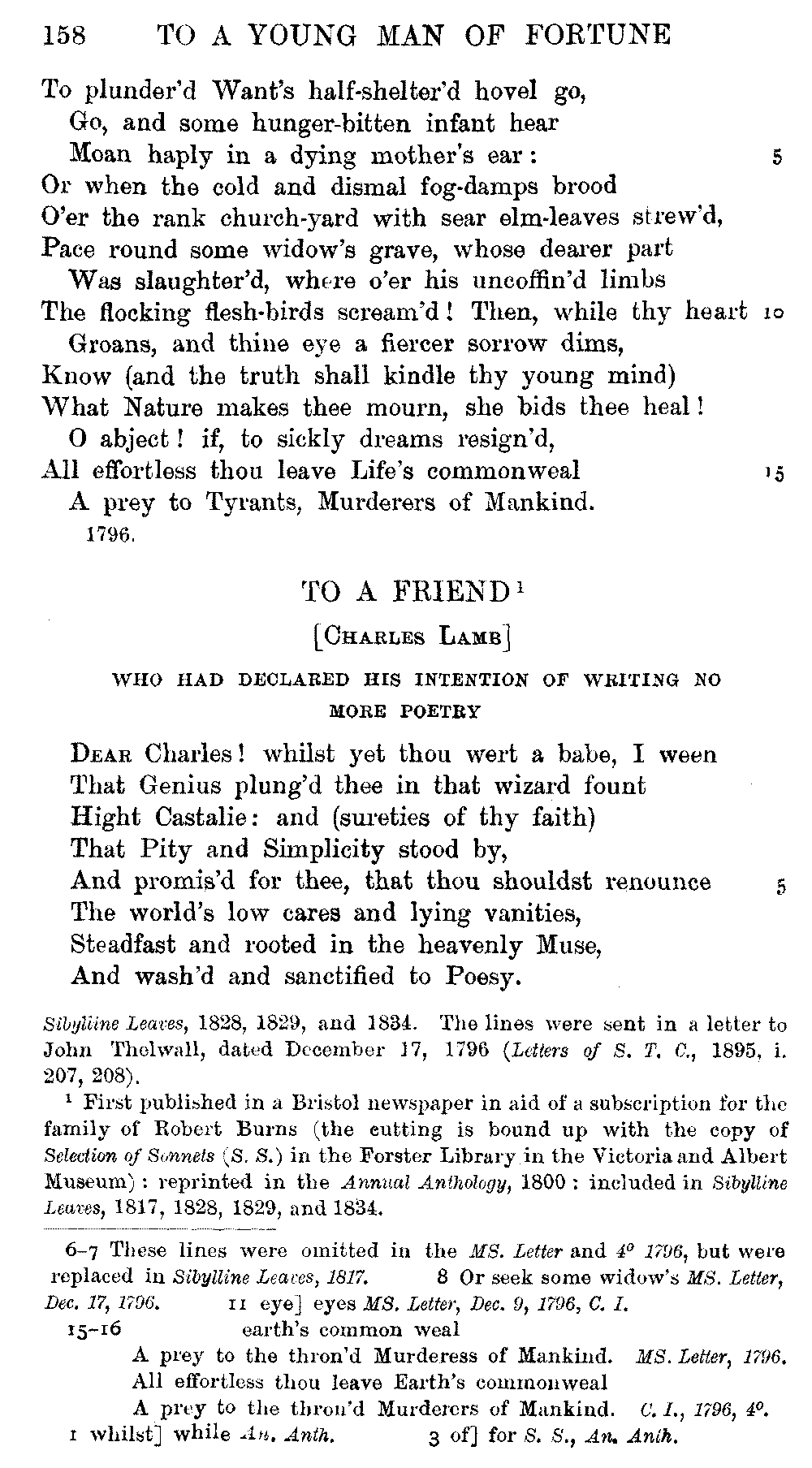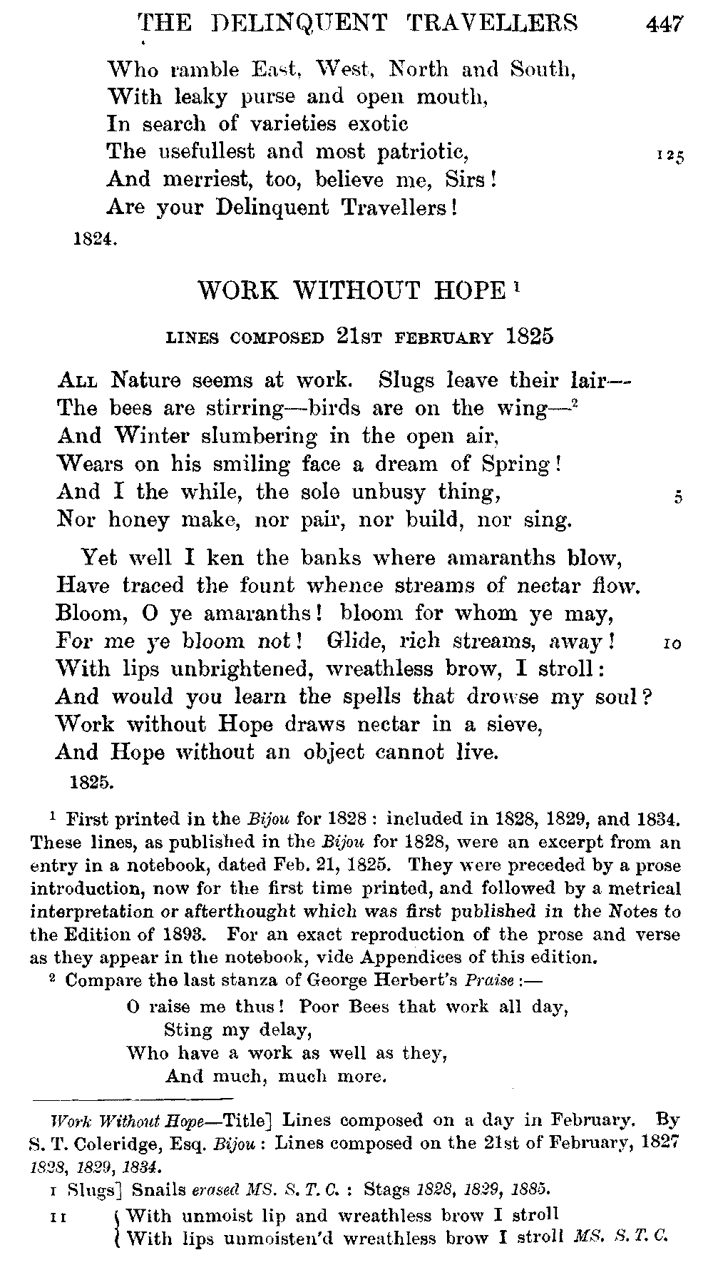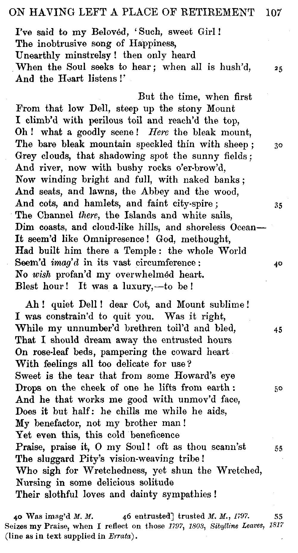 My plea is that it is difficult if not impossible to draw a line above which a variant is important and below which it is negligible; that, to use a word of the poet's own coining, his emendations are rarely if ever 'lightheartednesses'; and that if a collation of the printed text with MSS. is worth studying at all the one must be as decipherable as the other. Facsimiles are rare and costly productions, and an exhaustive table of variants is the nearest approach to a substitute. Many, I know, are the shortcomings, too many, I fear, are the errors in the footnotes to this volume, but now, for the first time, the MSS. of Coleridge's poems which are known to be extant are in a manner reproduced and made available for study and research.