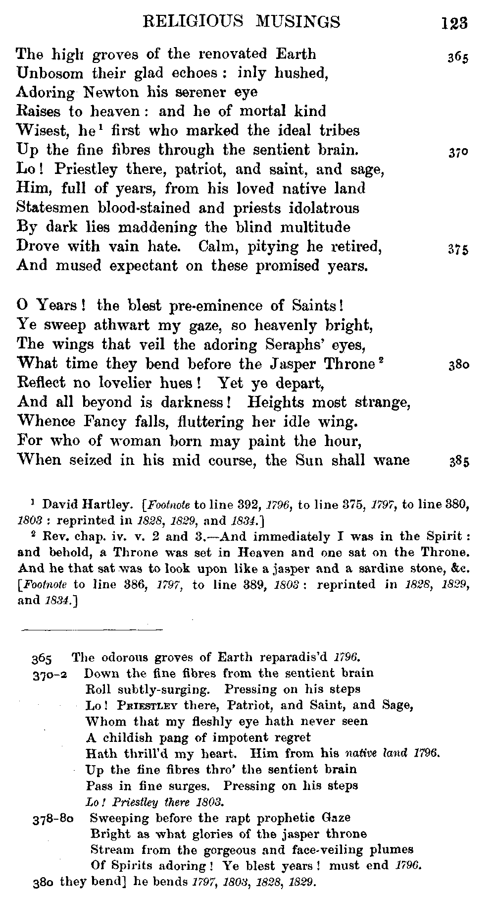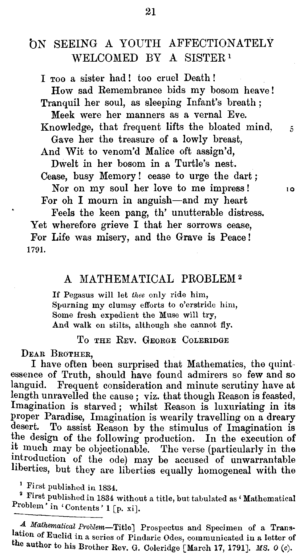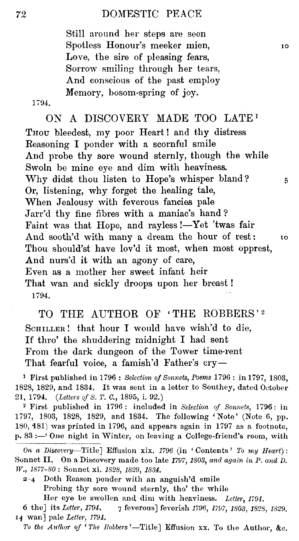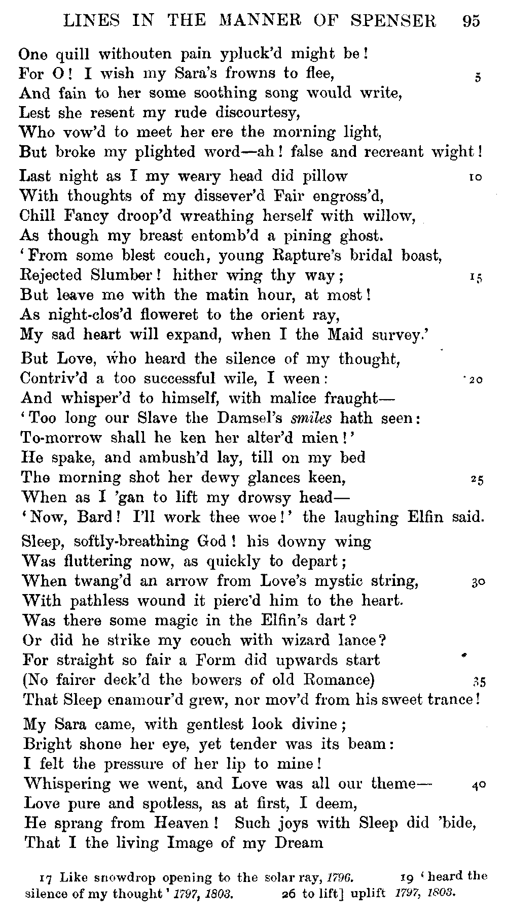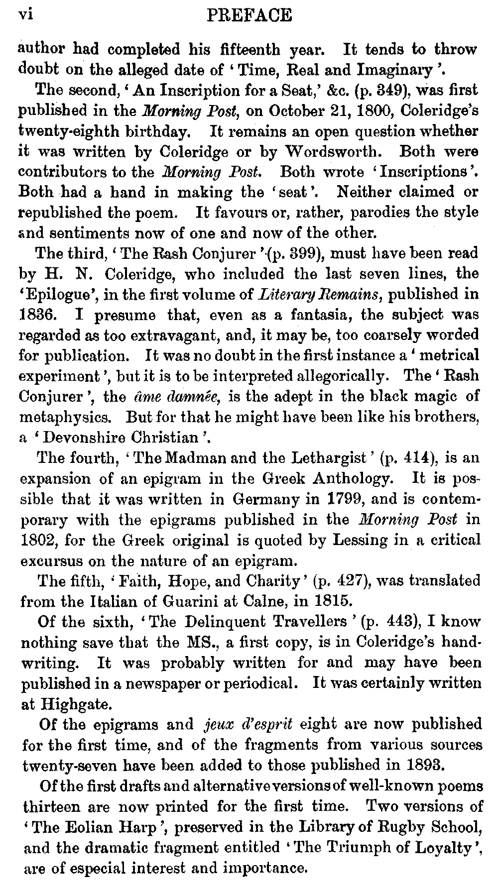 No apology is needed for publishing a collation of the text of Coleridge's Poems with that of earlier editions or with the MSS. of first drafts and alternative versions. The first to attempt anything of the kind was Richard Herne Shepherd, the learned and accurate editor of the Poetical Works in four volumes, issued by Basil Montagu Pickering in 1877. Important variants are recorded by Mr. Campbell in his Notes to the edition of 1893; [v]and in a posthumous volume, edited by Mr. Hale White in 1899 (Coleridge's Poems, &c.), the corrected parts of 'Religious Musings', the MSS. of 'Lewti', the 'Introduction to the Dark Ladié', and other poems are reproduced in facsimile. Few poets have altered the text of their poems so often, and so often for the better, as Coleridge. He has been blamed for 'writing so little', for deserting poetry for metaphysics and theology; he has been upbraided for winning only to lose the 'prize of his high calling'. Sir Walter Scott, one of his kindlier censors, rebukes him for 'the caprice and indolence with which he has thrown from him, as if in mere wantonness, those unfinished scraps of poetry, which like the Torso of antiquity defy the skill of his poetical brethren to complete them'. But whatever may be said for or against Coleridge as an 'inventor of harmonies', neither the fineness of his self-criticism nor the laborious diligence which he expended on perfecting his inventions can be gainsaid. His erasures and emendations are not only a lesson in the art of poetry, not only a record of poetical growth and development, but they discover and reveal the hidden springs, the thoughts and passions of the artificer.