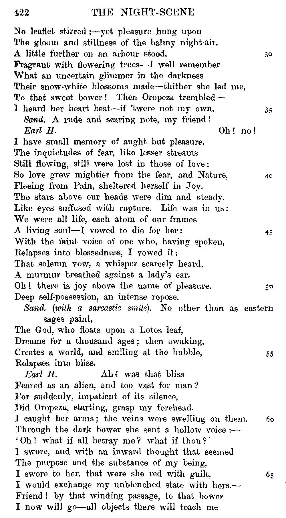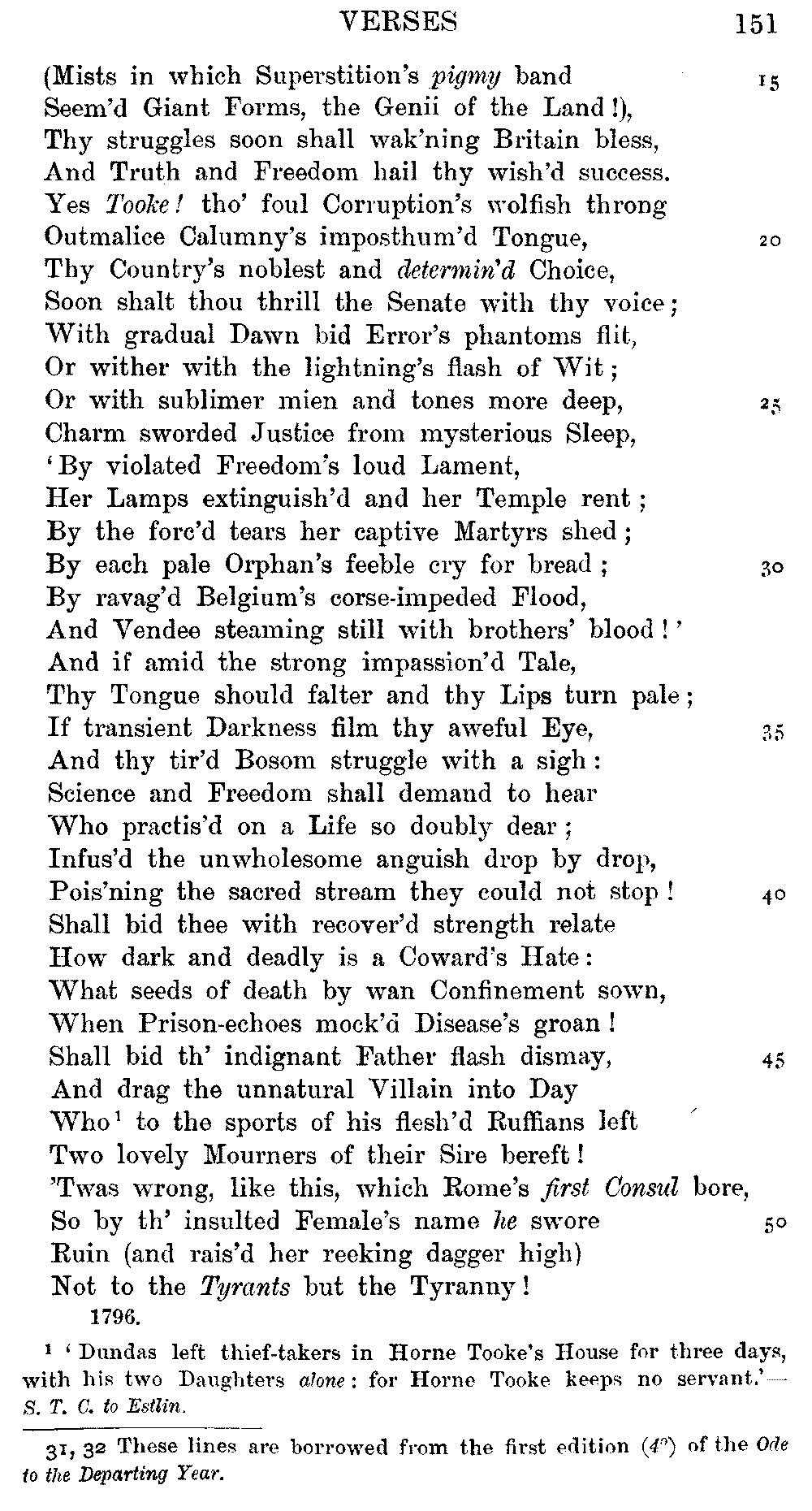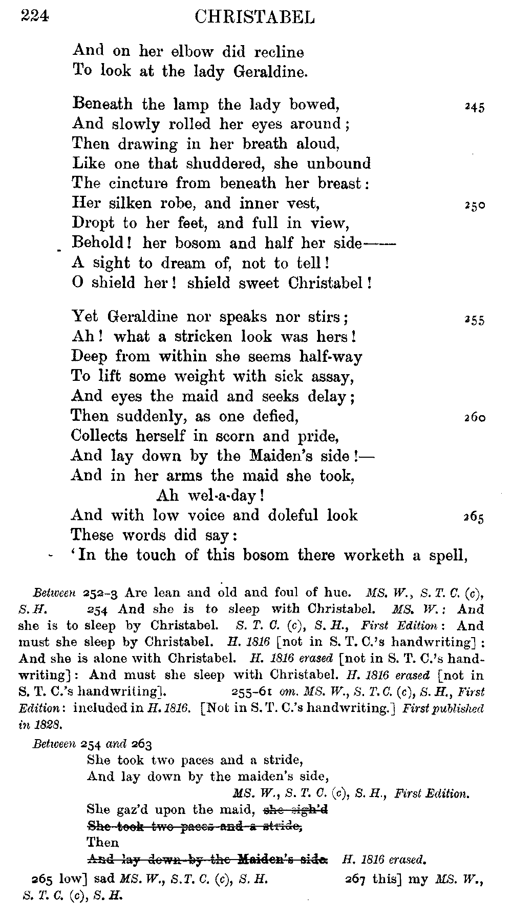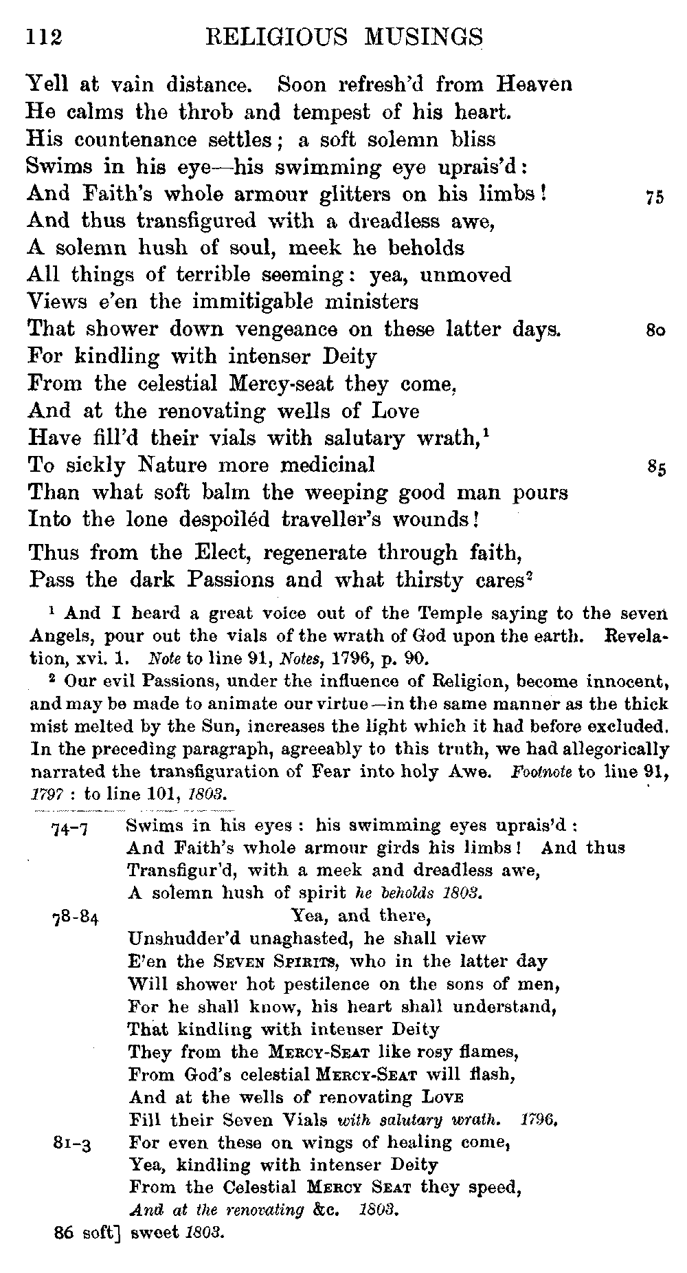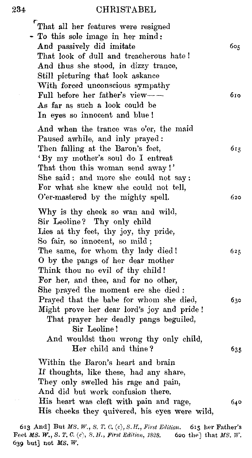 No apology is needed for publishing a collation of the text of Coleridge's Poems with that of earlier editions or with the MSS. of first drafts and alternative versions. The first to attempt anything of the kind was Richard Herne Shepherd, the learned and accurate editor of the Poetical Works in four volumes, issued by Basil Montagu Pickering in 1877. Important variants are recorded by Mr. Campbell in his Notes to the edition of 1893; [v]and in a posthumous volume, edited by Mr. Hale White in 1899 (Coleridge's Poems, &c.), the corrected parts of 'Religious Musings', the MSS. of 'Lewti', the 'Introduction to the Dark Ladié', and other poems are reproduced in facsimile. Few poets have altered the text of their poems so often, and so often for the better, as Coleridge. He has been blamed for 'writing so little', for deserting poetry for metaphysics and theology; he has been upbraided for winning only to lose the 'prize of his high calling'. Sir Walter Scott, one of his kindlier censors, rebukes him for 'the caprice and indolence with which he has thrown from him, as if in mere wantonness, those unfinished scraps of poetry, which like the Torso of antiquity defy the skill of his poetical brethren to complete them'. But whatever may be said for or against Coleridge as an 'inventor of harmonies', neither the fineness of his self-criticism nor the laborious diligence which he expended on perfecting his inventions can be gainsaid. His erasures and emendations are not only a lesson in the art of poetry, not only a record of poetical growth and development, but they discover and reveal the hidden springs, the thoughts and passions of the artificer.