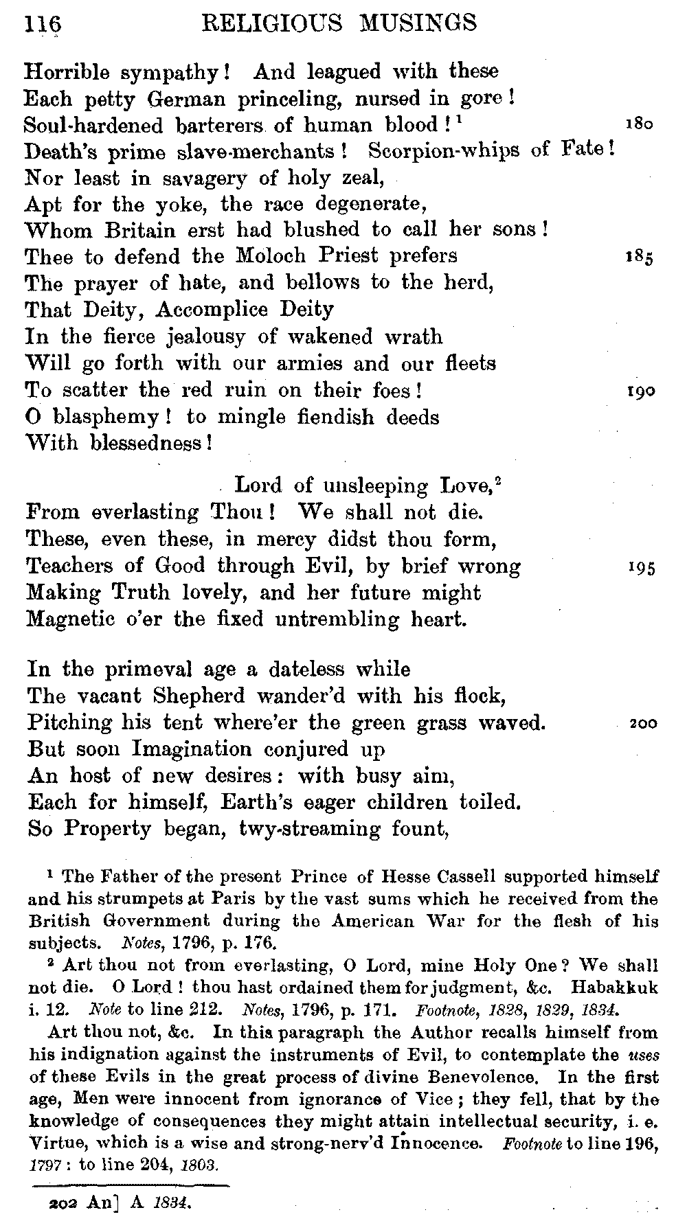 The first edition of the Poetical Works, based on all previous editions, and including the contents of Literary Remains (vol. i) and of Essays on His Own Times (vol. iii), was issued by Basil Montagu Pickering in four volumes in 1877. Many poems (including 'Remorse') were collated for the first time with the text of previous editions and newspaper versions by the editor, Richard Herne Shepherd. The four volumes (with a Supplement to vol. ii) were reissued by Messrs. Macmillan in 1880.