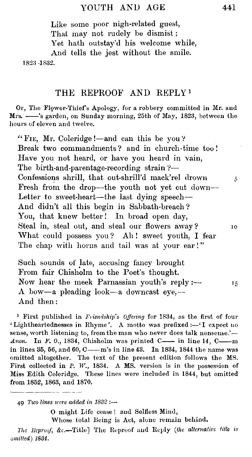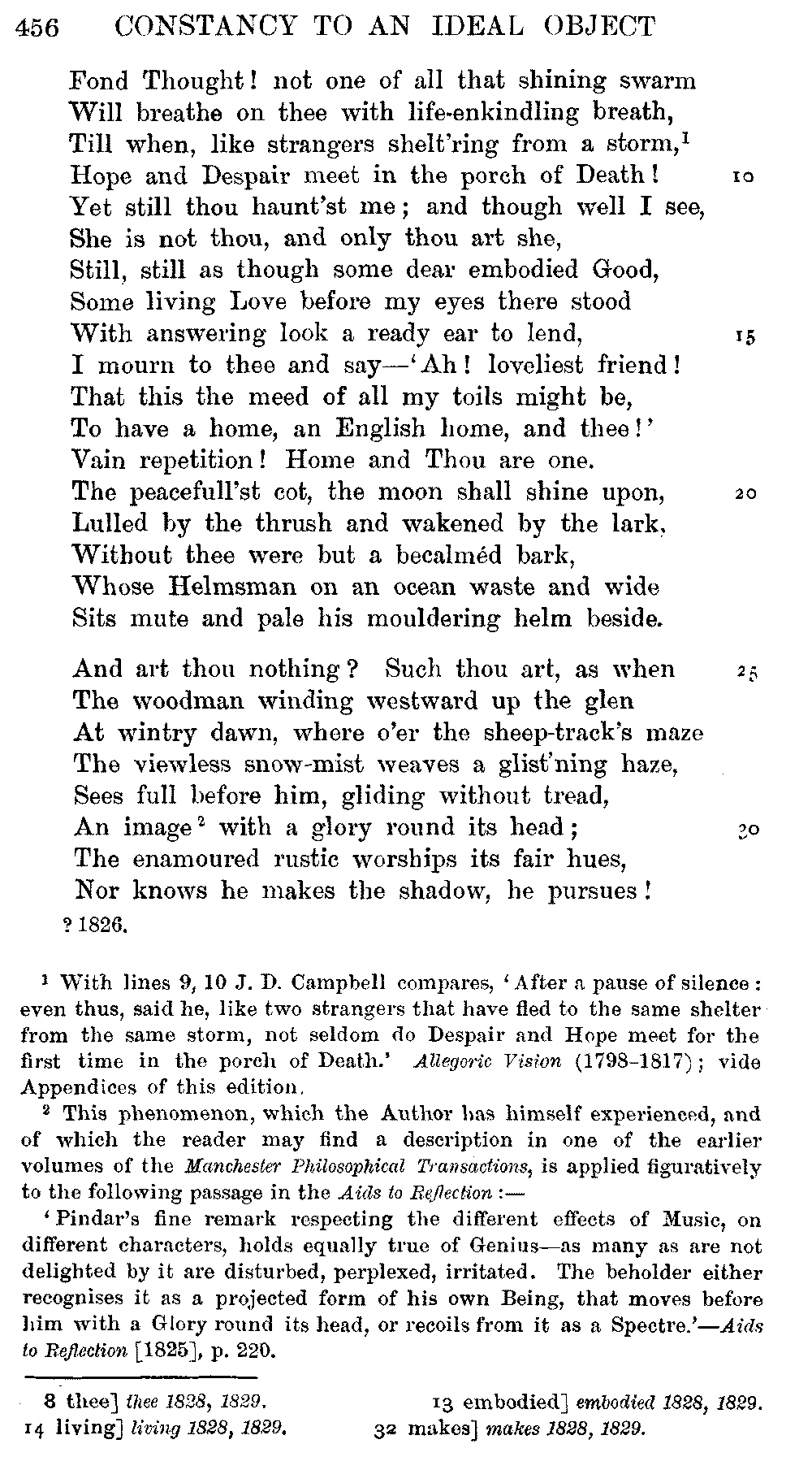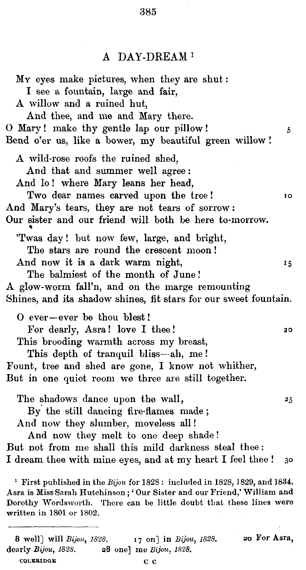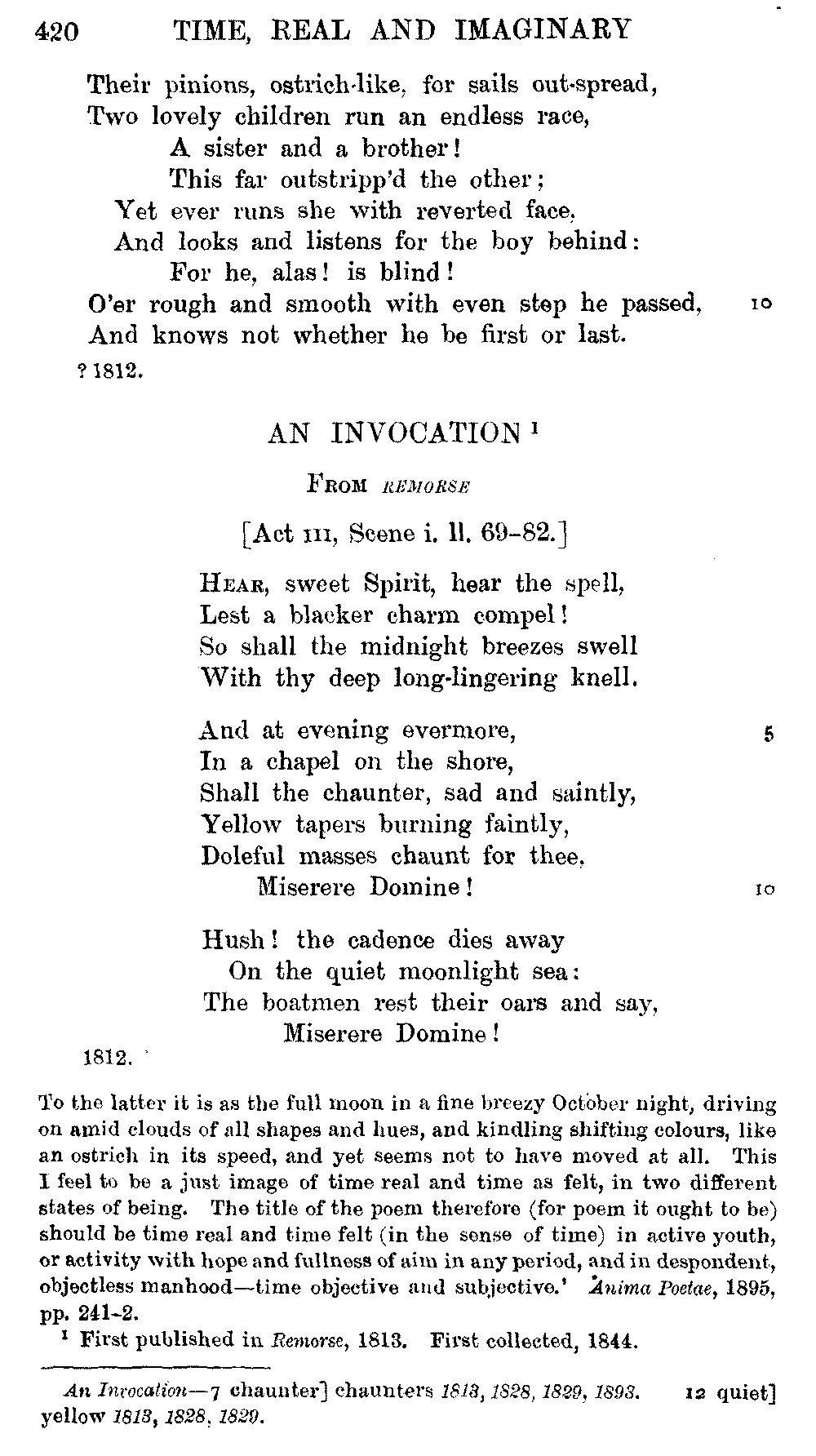 I have adopted the text of 1834 in preference to that of 1829, which was selected by James Dykes Campbell for his monumental edition of 1893. I should have deferred to his authority but for the existence of conclusive proof that, here and there, Coleridge altered and emended the text of 1829, with a view to the forthcoming edition of 1834. In the Preface to the 'new edition' of 1852, the editors maintain that the three-volume edition of 1828 (a mistake for 1829) was the last upon which Coleridge was 'able to bestow personal care and attention', while that of 1834 was 'arranged mainly if not entirely at the discretion of his latest editor, H. N. Coleridge'. This, no doubt, was perfectly true with regard to the choice and arrangement of the poems, and the labour of seeing the three volumes through the press; but the fact remains that the text of 1829 differs from that of 1834, and that Coleridge himself, and not his 'latest editor', was responsible for that difference.