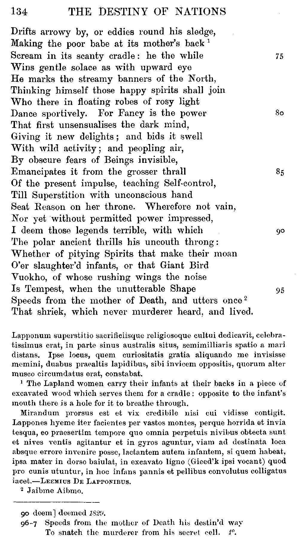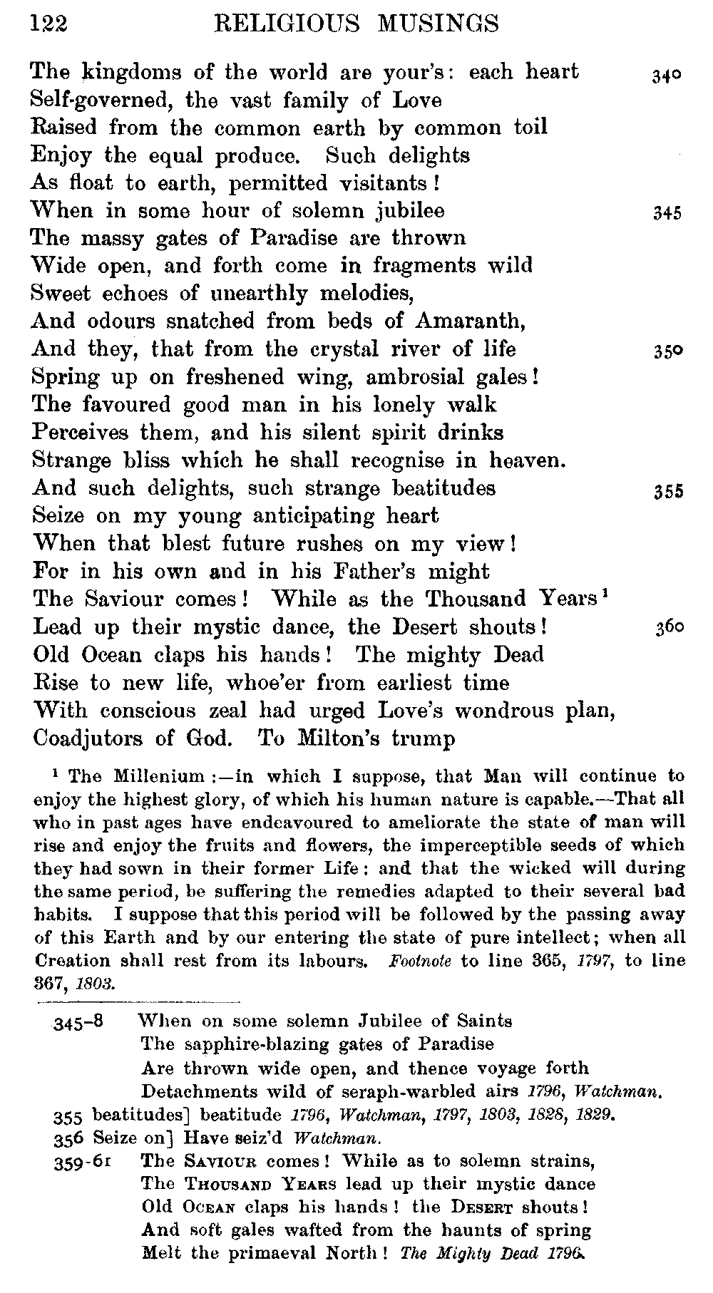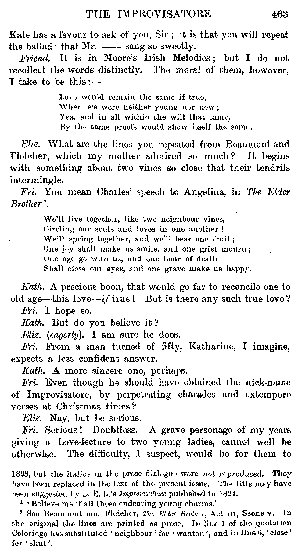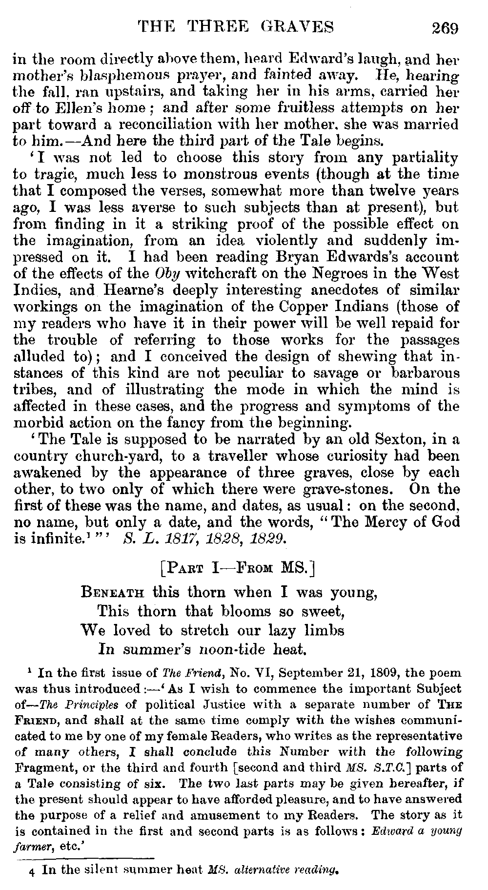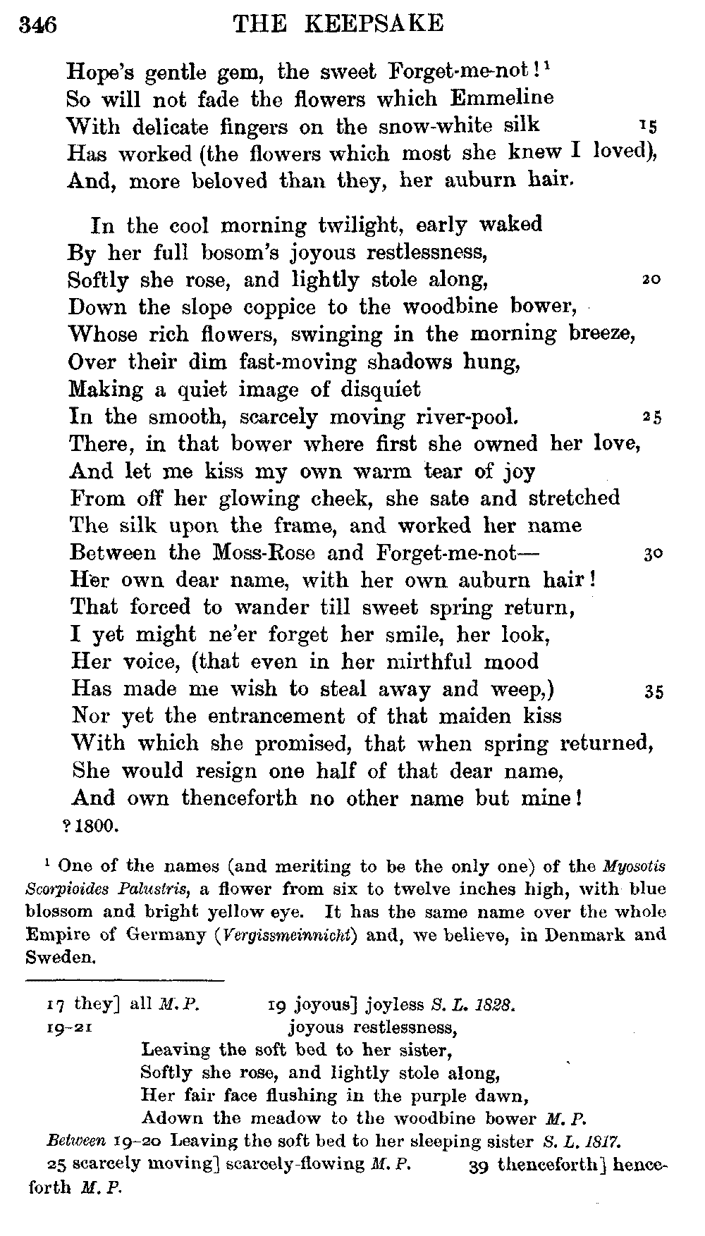 I have adopted the text of 1834 in preference to that of 1829, which was selected by James Dykes Campbell for his monumental edition of 1893. I should have deferred to his authority but for the existence of conclusive proof that, here and there, Coleridge altered and emended the text of 1829, with a view to the forthcoming edition of 1834. In the Preface to the 'new edition' of 1852, the editors maintain that the three-volume edition of 1828 (a mistake for 1829) was the last upon which Coleridge was 'able to bestow personal care and attention', while that of 1834 was 'arranged mainly if not entirely at the discretion of his latest editor, H. N. Coleridge'. This, no doubt, was perfectly true with regard to the choice and arrangement of the poems, and the labour of seeing the three volumes through the press; but the fact remains that the text of 1829 differs from that of 1834, and that Coleridge himself, and not his 'latest editor', was responsible for that difference.