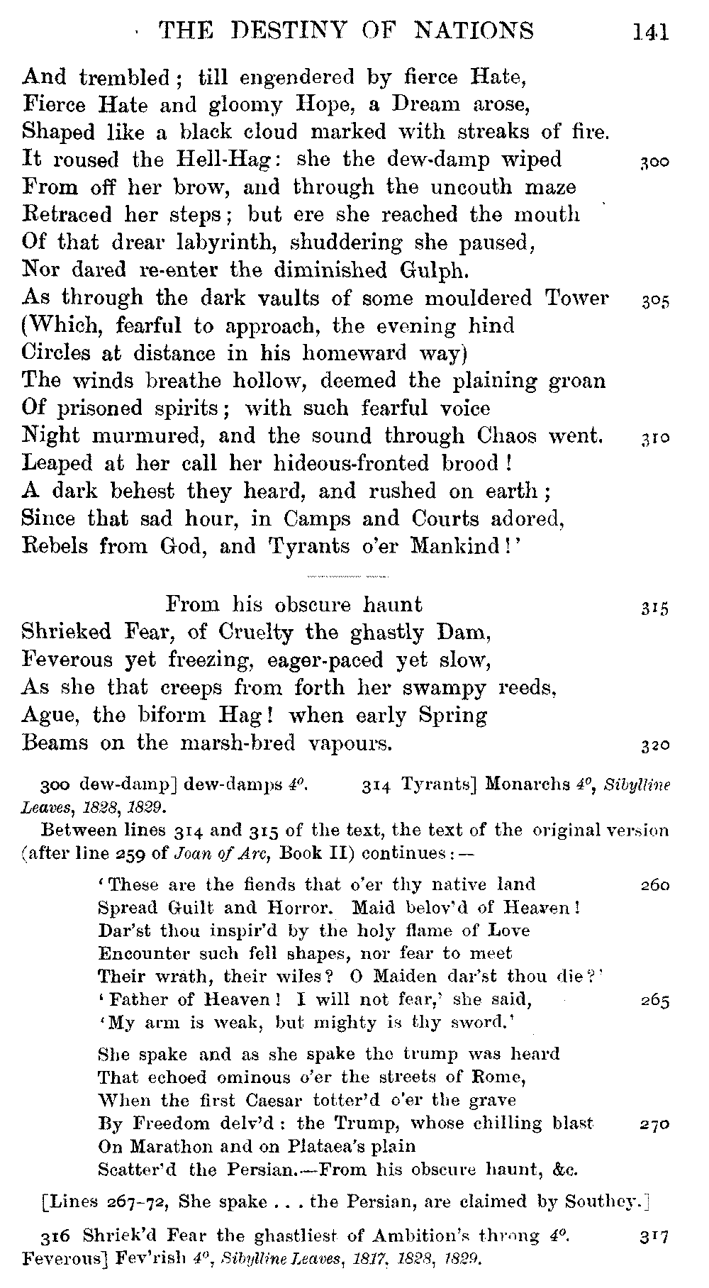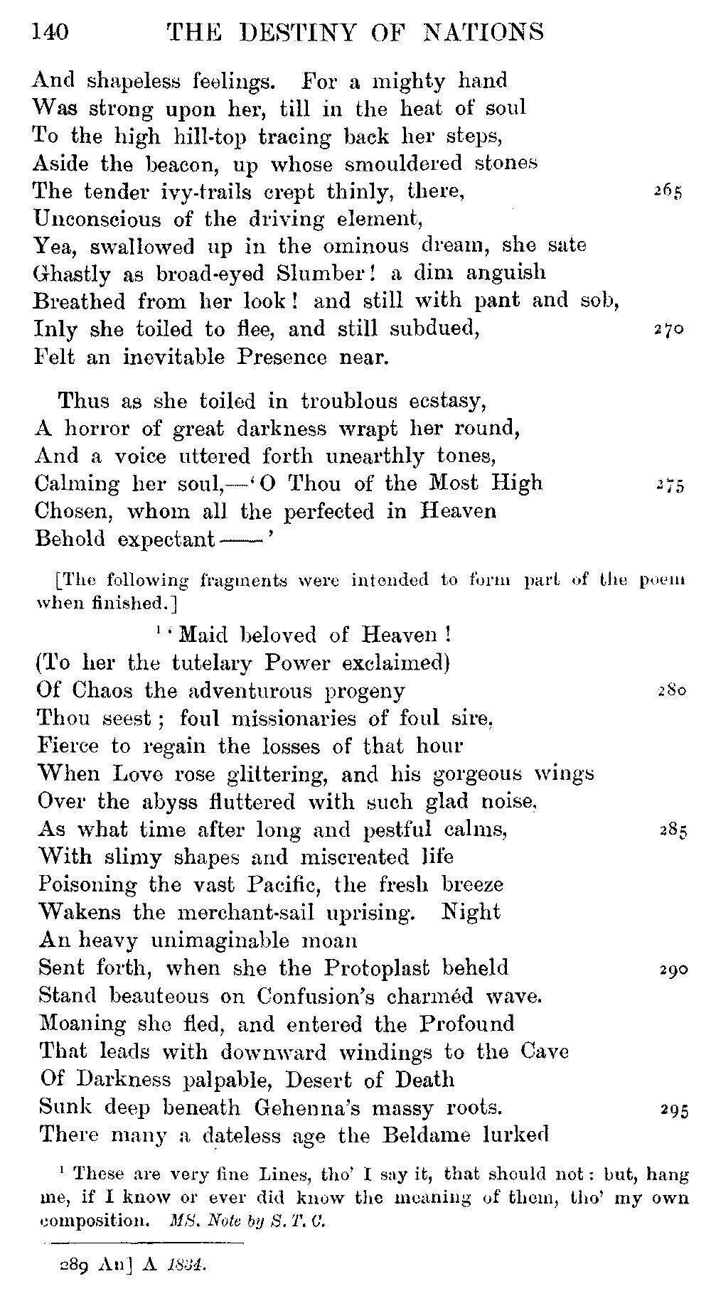 I have in my possession the proof of the first page of the 'Destiny of Nations' as it appeared in 1828 and 1829. Line 5 ran thus: 'The Will, the Word, the Breath, the [iv]Living God.' This line is erased and line 5 of 1834 substituted: 'To the Will Absolute, the One, the Good' and line 6, 'The I am, the Word, the Life, the Living God,' is added, and, in 1834, appeared for the first time. Moreover, in the 'Songs of the Pixies', lines 9, 11, 12, 15, 16, as printed in 1834, differ from the readings of 1829 and all previous editions. Again, in 'Christabel' lines 6, 7 as printed in 1834 differ from the versions of 1828, 1829, and revert to the original reading of the MSS. and the First Edition. It is inconceivable that in Coleridge's lifetime and while his pen was still busy, his nephew should have meddled with, or remodelled, the master's handiwork.