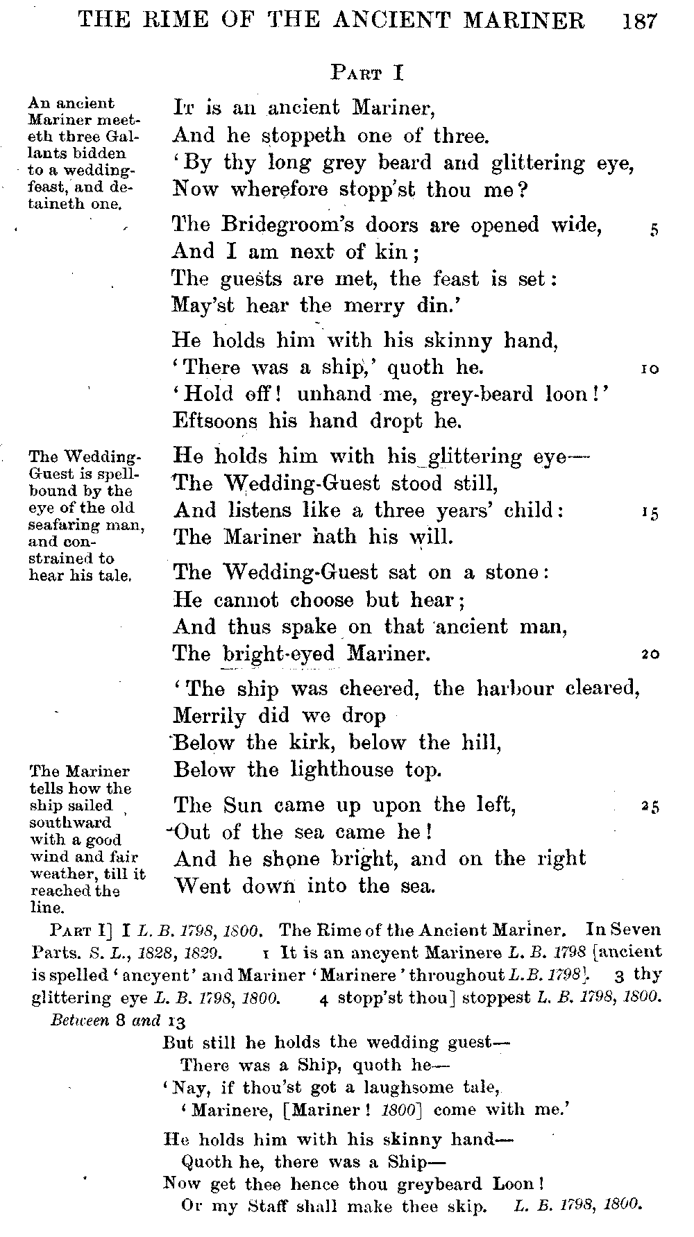 [vii]An exact reproduction of the text of the 'Ancyent Marinere' as printed in an early copy of the Lyrical Ballads of 1798 which belonged to S. T. Coleridge, and a collation of the text of the 'Introduction to the Tale of the Dark Ladié', as published in the Morning Post, Dec. 21, 1799, with two MSS. preserved in the British Museum, are included in Appendix No. I.