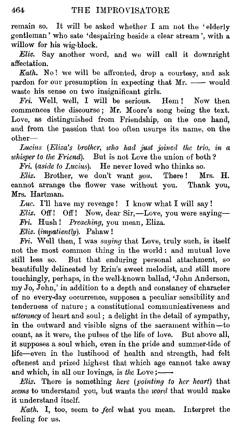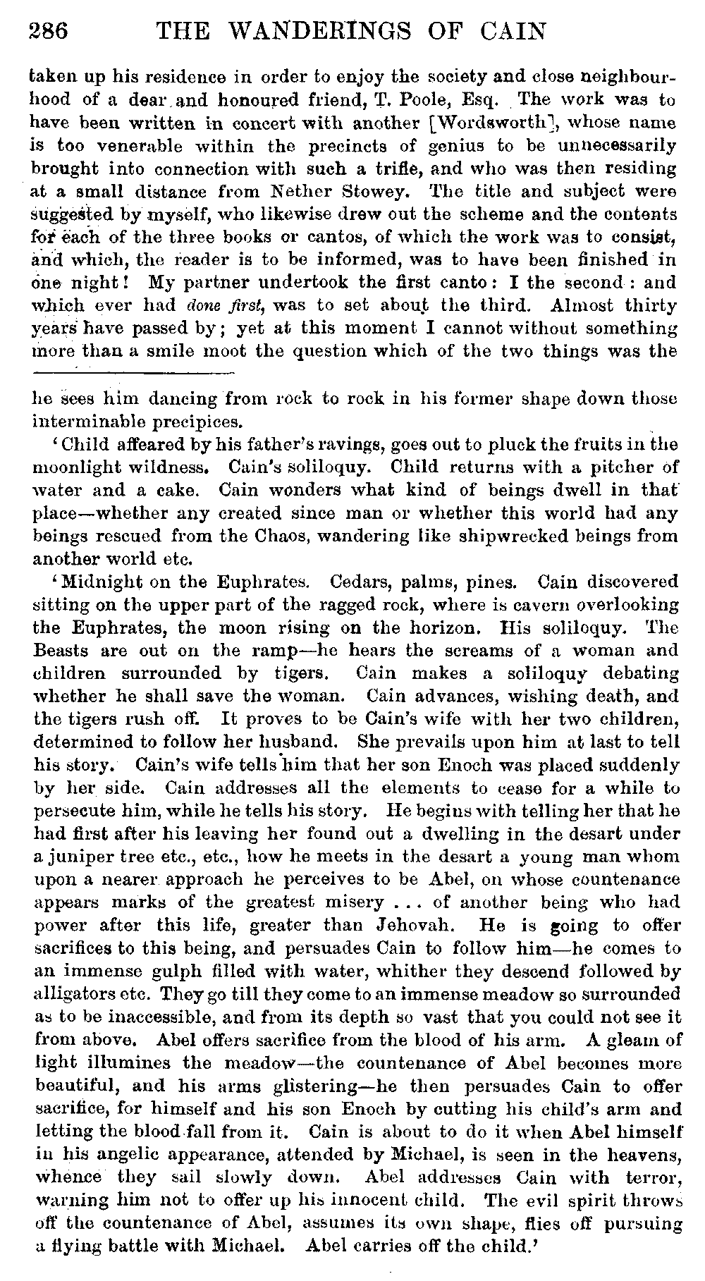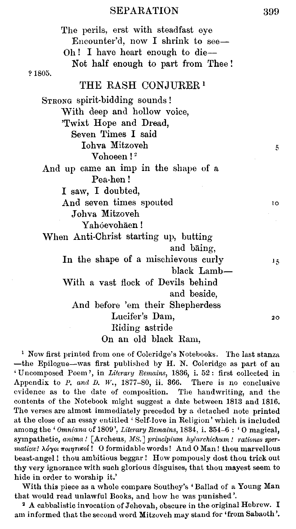 The third, 'The Rash Conjurer' (p. 399), must have been read by H. N. Coleridge, who included the last seven lines, the 'Epilogue', in the first volume of Literary Remains, published in 1836. I presume that, even as a fantasia, the subject was regarded as too extravagant, and, it may be, too coarsely worded for publication. It was no doubt in the first instance a 'metrical experiment', but it is to be interpreted allegorically. The 'Rash Conjurer', the âme damnée, is the adept in the black magic of metaphysics. But for that he might have been like his brothers, a 'Devonshire Christian'.