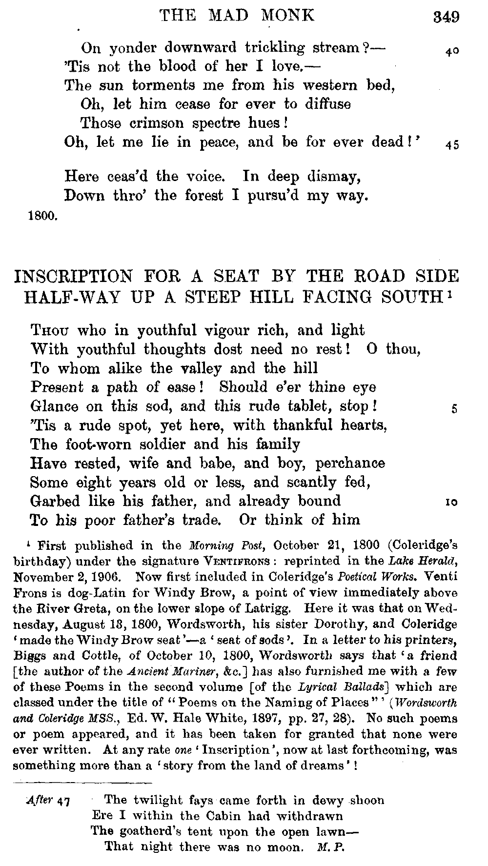 The second,'An Inscription for a Seat,' &c. (p. 349), was first published in the Morning Post, on October 21, 1800, Coleridge's twenty-eighth birthday. It remains an open question whether it was written by Coleridge or by Wordsworth. Both were contributors to the Morning Post. Both wrote 'Inscriptions'. Both had a hand in making the 'seat'. Neither claimed or republished the poem. It favours or, rather, parodies the style and sentiments now of one and now of the other.