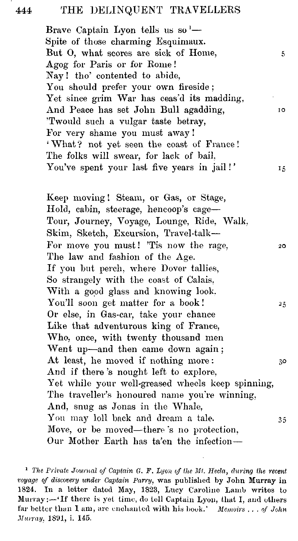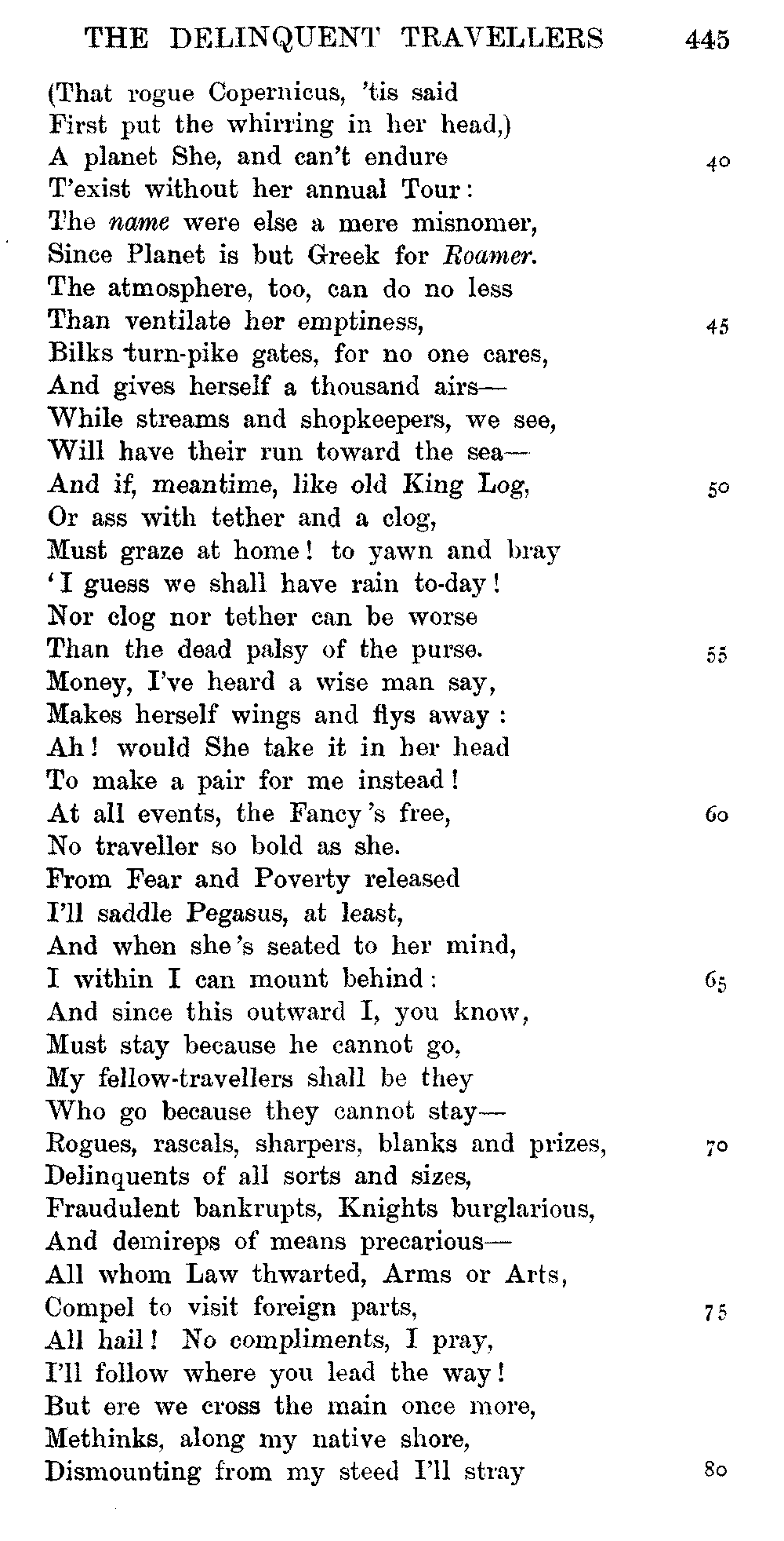 Of the sixth, 'The Delinquent Travellers' (p. 443), I know nothing save that the MS., a first copy, is in Coleridge's handwriting. It was probably written for and may have been published in a newspaper or periodical. It was certainly written at Highgate.