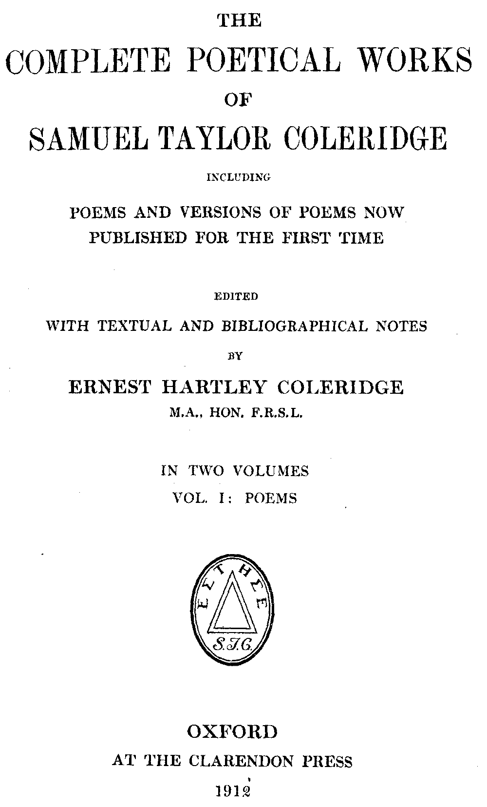 The aim and purport of this edition of the Poetical Works of Samuel Taylor Coleridge is to provide the general reader with an authoritative list of the poems and dramas hitherto published, and at the same time to furnish the student with an exhaustive summary of various readings derived from published and unpublished sources, viz. (1) the successive editions issued by the author, (2) holograph MSS., or (3) contemporary transcriptions. Occasion has been taken to include in the Text and Appendices a considerable number of poems, fragments, metrical experiments and first drafts of poems now published for the first time from MSS. in the British Museum, from Coleridge's Notebooks, and from MSS. in the possession of private collectors.