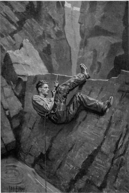 He rose to his feet and walked down to a ledge on the brink of the precipice with an air of bravado. But when he looked over into the chasm, he quickly shrank back and crouched on his hands and knees. Before again peering over he stretched himself out flat on the level ledge and grasped an out-jutting point of rock.