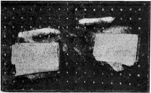 The above is a photograph of the actual porous plaster and pads produced by Yoga Rama as a means of "blindfolding." The plaster is seen exactly as it was when taken off by Mr. William Marriott. It will be seen that the pads have shifted, allowing comparatively clear vision with one eye. The tissue paper, making the plaster non-adhesive, will also be noticed.