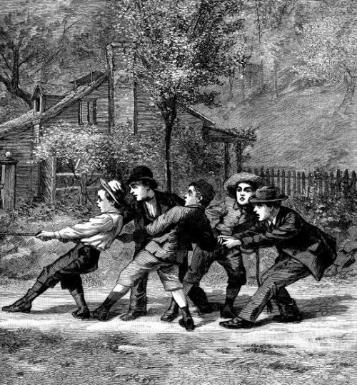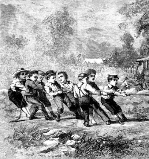This is an old English game, which has become a favorite athletic exercise in almost all countries, as a trial of strength and endurance. In England it used to be called "French and English," from the ancient rivalry that existed between the two nationalities. Our picture shows how the game is played. Care should be taken to have a stout rope, and the players should be divided so that each party may as nearly as possible be of equal strength. The party that pulls the other over a line marked on the ground between them is the winner in the game. Sometimes a string is tied on the rope, and when the game begins this string should be directly over the dividing line. It often happens that the parties are so evenly matched that neither can pull the string more than an inch or two over the line; and then it becomes a trial of endurance, and the question is which side can hold out the longer.[Pg 705]