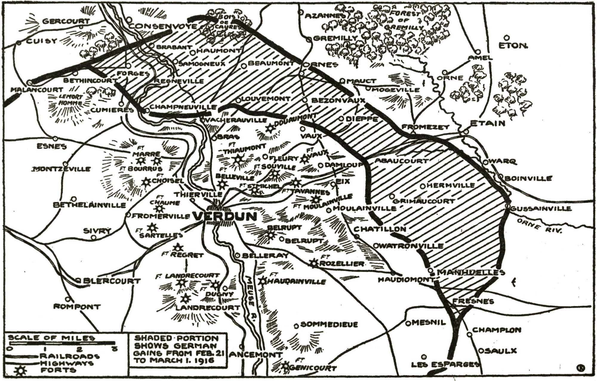 Seven French aeroplanes flew over the Woevre region on this day, penetrating as far as Vigneulles, where the aerial observers discovered barracks covered with heavy corrugated iron. The machines descended in long spirals and dropped a number of (p. 021) bombs, setting the barracks afire. Troops were seen rushing in all directions from the burning structures.
