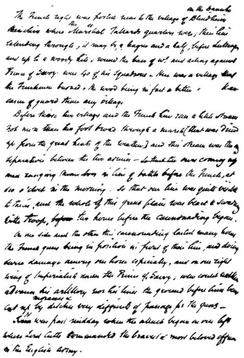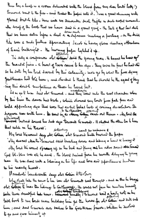 “There are three separate handwritings. Thackeray's own small upright handwriting; that of his daughter, now Mrs. Richmond Ritchie, a rather large round handwriting; and that of an amanuensis whose name I do not know. The interest is mainly this, that it shows that Thackeray dictated a considerable part of the book; and, as Mrs. Ritchie tells me, he dictated it without having previously written anything. The copy was sent straight to press as it stands, with, as you will see, remarkably little alteration. As Esmond is generally considered to be his most perfect work in point of style, I think that this is a remarkable fact and adds considerably to the interest of the MS.”
