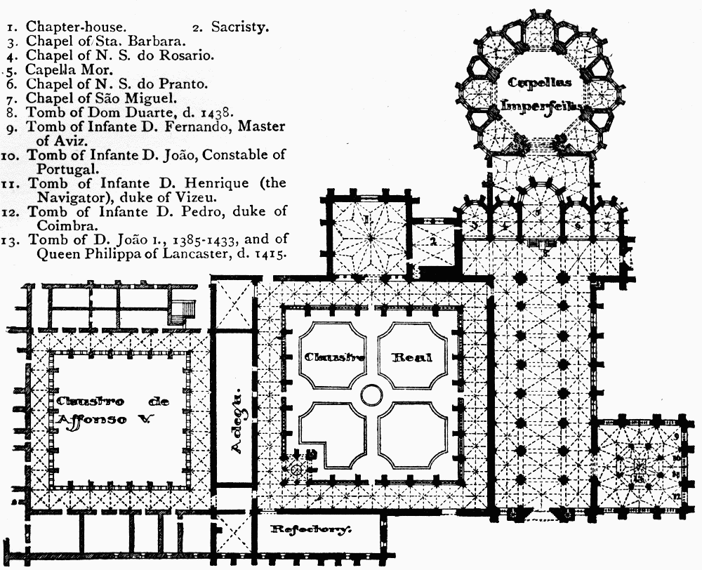 | The thirteenth century poor in buildings—The Franciscans—São Francisco Guimarães—Santarem—Santa Maria dos Olivaes at Thomar—Cf. aisle windows at Leça do Balio—Inactivity and deposition of Dom Sancho ii. by Dom Affonso iii.—Conquest of Algarve—Sé, Silves—Dom Diniz and the castles at Beja and at Leiria—Cloisters, Cellas, Coimbra, Alcobaça, Lisbon, and Oporto—St. Isabel and Sta. Clara at Coimbra—Leça do Balio—The choir of the cathedral, Lisbon, with tombs—Alcobaça, royal tombs—Dom Pedro i. and Inez de Castro; her murder, his sorrow—Their tombs | 64-78 |