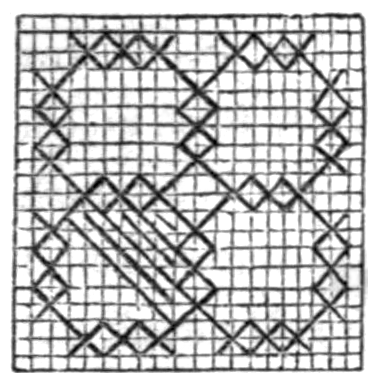 Canvas (very coarse) ten threads to the inch. Work in cross stitch, over one thread, with single wool. If used for grounding, work in two threads. This will accelerate the work, and look equally well.