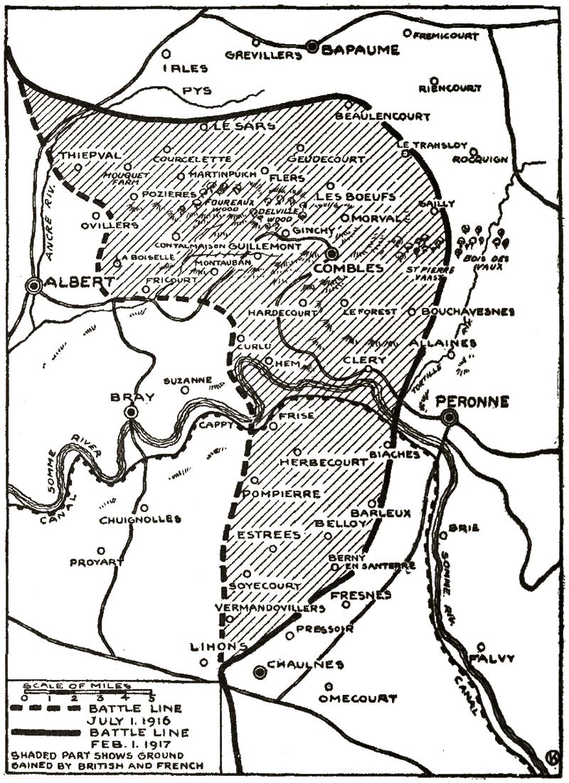 The first month of the Allied offensive on the Somme front closed quietly. The British and French forces had every reason to feel encouraged over their successes. In the two thrusts since July 1, 1916, they had won from the Germans nearly twenty-four square miles of territory. Considering the extent to which every fraction of a mile was fortified and defended, and the thoroughness of the German preparations to make the district impregnable, the Allied gains were important. As a British officer said at the time, it was like digging badgers out of holes—with the proviso that every badger had machine guns and rifles at the hole's mouth, while the approach to each was swept by the fire from a dozen neighboring earthworks.