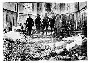 Le père supérieur et ses frères s'étaient réfugiés au fond du jardin de l'école; les coups de feu éclataient toujours et l'incendie gagnait le centre de la ville.