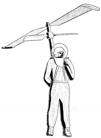 The flying platform would have no need for rapid forward motion, at least inside the atmosphere and therefore would have little need for streamlining or protective covering for the passengers, who would carry their equipment with them. Most of the equipment for the survey would be built into the suits. They would each carry a set of portable helicopter attachments so they could cover more ground in a hurry. Like small helicopters of our time, these probably would have a rather limited speed and range, but they would be extremely maneuverable.