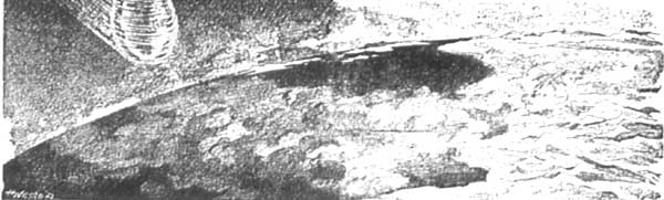In the midst of this dark inferno, Tantril's ranch was an island of stillness. Within the high guarding fence, the long low buildings lay quiet and were [illegible] brushed periodically by the light from the watch-beacon high overhead as it swept its shaft over the jungle smother and then around over the black glassy surface of the Great Briney Lake, bordering the ranch enclosure on the fourth side. And, vigilantly, the eyes of three Venusian guards followed the ray.