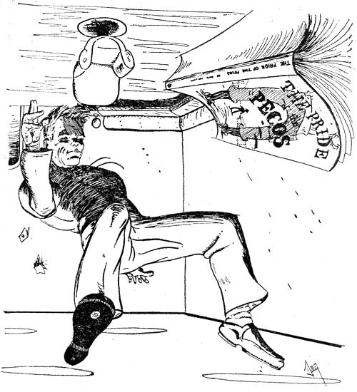 Aside from "The Pride of the Pecos" and a couple of other books, the air was remarkably free from clutter. There hadn't been much loose stuff laying around. A pencil, a few sheets of paper—nothing more.