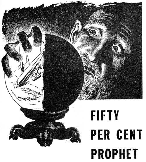 Project Gutenberg's Fifty Per Cent Prophet, by Gordon Randall Garrett This eBook is for the use of anyone anywhere at no cost and with almost no restrictions whatsoever. You may copy it, give it away or re-use it under the terms of the Project Gutenberg License included with this eBook or online at www.gutenberg.org Title: Fifty Per Cent Prophet Author: Gordon Randall Garrett Illustrator: Schoenherr Release Date: October 25, 2009 [EBook #30337] Language: English Character set encoding: ISO-8859-1 *** START OF THIS PROJECT GUTENBERG EBOOK FIFTY PER CENT PROPHET *** Produced by Sankar Viswanathan, Greg Weeks, and the Online Distributed Proofreading Team at http://www.pgdp.net