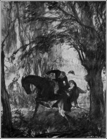 He tried to swing her to the pommel, but she fought herself free and came to the ground and was almost trampled.