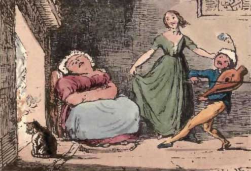 In a yellow petticoat, and a green gown.