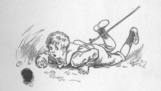The clover they had eaten had made them feel rather sleepy, but now they were beginning to recover from the effects of it, and now they suddenly became quite frisky. Punch leaped over Judy's back, and then chased her into the middle of the road and back again. Even old Jumbo caught the infection, and though he very seldom condescended to take any notice of the other rabbits, now he gave Toby a playful poke with his nose, following it up by a bite on his ear that was not quite so playful. Toby gave a loud squeak of pain, and Jumbo, afraid perhaps that he might receive a bite in return, jumped through the bars and scampered down the field. He was half-way to the river before the children recovered from their surprise, and shouted to him to come back. But the more they shouted the faster he ran. And that was not the worst either, for the other rabbits were after him in a twinkling. But quick as they were Jim was quicker. He had no intention of allowing such an excellent opportunity of exploring the forbidden ground to slip, and crying that it was of no use to call to Jumbo he scrambled over the gate and rushed helter-skelter down the field, taking great care, however, not to get in front of Jumbo, but running behind him shouting and waving his hands.