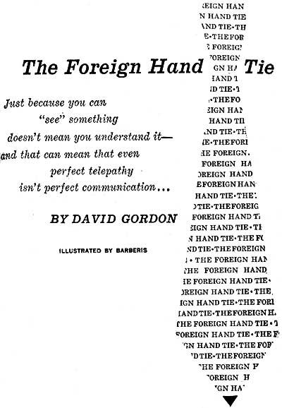Project Gutenberg's The Foreign Hand Tie, by Gordon Randall Garrett This eBook is for the use of anyone anywhere at no cost and with almost no restrictions whatsoever. You may copy it, give it away or re-use it under the terms of the Project Gutenberg License included with this eBook or online at www.gutenberg.org Title: The Foreign Hand Tie Author: Gordon Randall Garrett Illustrator: Barberis Release Date: November 18, 2009 [EBook #30497] Language: English Character set encoding: ISO-8859-1 *** START OF THIS PROJECT GUTENBERG EBOOK THE FOREIGN HAND TIE *** Produced by Sankar Viswanathan, Greg Weeks, and the Online Distributed Proofreading Team at http://www.pgdp.net