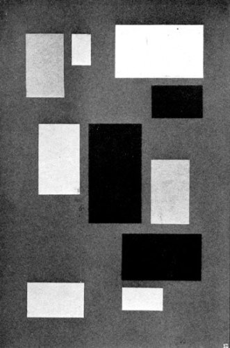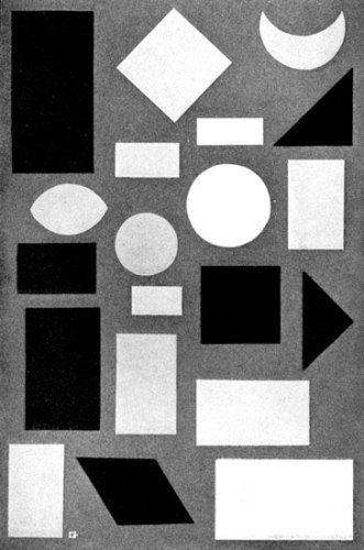 Let us discover the embodiment of these qualities of design with a simple experiment. Cut from black, dark gray, and light gray cover paper a miscellaneous assortment of small pieces as shown in Fig. 3. This group of squares, oblongs, triangles, diamonds, circles, and whatnot has none of the qualities of design as it appears in Fig. 3.