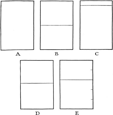 Let us arrive at the expression of good proportion by the simple means of dividing a rectangle into two parts which will have the most interesting relationship. This rectangle is A in Fig. 8. B shows a division into equal parts, the result being uninteresting and monotonous. In C the division gives a feeling that the lower part is too large; it is crowding the upper and the result is not pleasing. The relationship in D is so nearly equal that the division seems to have been an inaccurate effort to locate the center. Somewhere[Pg 20] between the division point in C and that in D will probably be the best point. Repeated trials will locate the point about as in E, which will be found to lie about two-fifths of the distance down from the top. This will give the upper area in E an area of 2 and the lower an area of 3. Hence the relationship or proportion is said to be as 2 is to 3. By the term “good proportion,” or merely the word “proportion,” in speaking of design this ratio of 2 to 3 is assumed.