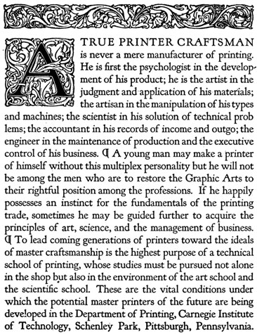 This primer of design is an earnest effort to make intelligible to the apprentice student certain fundamental principles of arrangement and of ornamentation whose use is instinctive to the accomplished typographer.