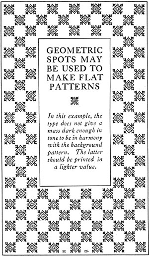 In the printed page, design is concerned with the arrangement of masses and lines on a flat surface—the face of the sheet of paper. Hence design in printing considers two dimensions only, width and length. The third dimension, depth, which must be treated in all but flat surfaces, can only be represented on the printed page and the means of showing depth is really an illusion by which the eye sees various colors and tones which convey a pictorial impression.