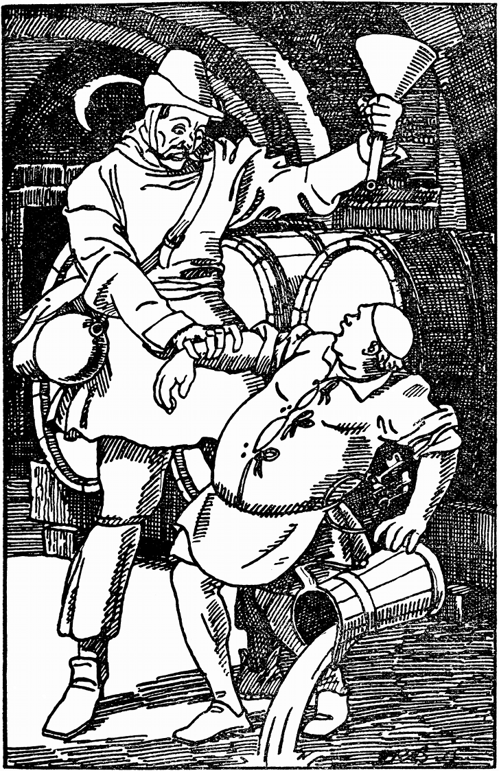 Am andern Morgen bat der Bursche: »Zeigt mir doch Euren Weinkeller.« Der Wirt traute sich nicht zu widersprechen, führte den Handwerksburschen hinab und ließ ihn von jedem Fasse kosten. Aber nur von den guten, in denen reiner Wein war. Schlupps aber entdeckte hinten in der Ecke zwei Fässer, die ihm verdächtig vorkamen, ging hin und wollte sie anzapfen.