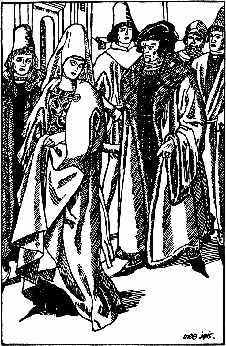 »Erzählt mir, wie das Gewand war,« bat sie. »Aus den [25]besten Stoffen,« erzählte das falsche Schneiderlein, »ein Unterkleid von gelbem Tuch, dazu ein Obergewand von rotem Sammet, die Ärmel gepufft aus heller Seide und alles fein mit bunten Bändern ausstaffiert. Auf dem Kopfe eine vier Ellen hohe Mütze aus Seide und Pelz und daran einen Schleier, so lang als Ihr seid und noch darüber, und die Schuhe – – die Schuhe, die waren mit dicken grünen Perlen besetzt. Eine goldene Kette lag um den Hals, die ging bis auf den Gürtel, und der war aus purem Golde mit bunten Steinen verziert. So müßt Ihr es auch haben. Wartet nur Ihr Bauern,« und er drohte mit der Faust hinaus in die Luft, »ich will Euch zeigen, wie man eine Prinzessin zu behandeln hat.«
