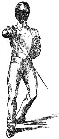 Before proceeding to the more technical portions of quarter-staff play, let me say that it is better to bar “points” in a friendly bout, for the weight of a stick, if only a bamboo cane, of eight feet[Pg 7] long, is so great, that it is an easy matter to break a collar-bone or rib with a rapid thrust. In any case, remember to be well padded and to have a good iron-wire broad-sword mask on before engaging in a bout.