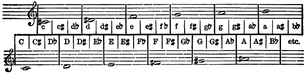 And within this duodecimal octave we have marked out a series of fixed intervals, seven in number, and founded thereon our entire art of music. What do I say—one series? Two such series, one for each leg: The Major and Minor Scales. When we start this series of intervals on some other degree of our semitonic ladder, we obtain a new key, and a “foreign” one, at that! How violently contracted a system arose from this initial confusion,[P] may be read in the law-books; we will not repeat it here.