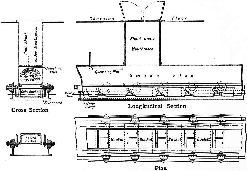 CONVEYORS. “Conveyor” (for derivation see Conveyance) is a term generally applied to mechanical devices designed for the purpose of moving material in a horizontal or slightly inclined direction; in this article, however, are included a variety of appliances for moving materials in horizontal, vertical and combined horizontal and vertical directions. The material so handled may be conveyed in a practically uninterrupted stream, 53 as in the case of worms, bands and pushplate conveyors, or elevators carrying grain or coal, &c.; or it may be conveyed from one point to another, intermittently, that is to say in a succession of separate loads, as happens with single bucket elevators, furnace hoists, rope and chain haulage, and also in the case of ropeways and aerial cableways. Some of these devices are of great antiquity, others are of quite modern origin. The principles of their construction are simple and easy of understanding, but by variations in the details of their construction the engineer has adapted these few appliances to the most varied work. At one end of the scale they may be used for such light duties as conveying the goods purchased by a customer to the packers and bringing them back made up into a parcel or for taking his money to the cashier and returning the change. At the other they are adopted for handling large quantities of heavy material at a minimum expenditure of human labour. Coal, for instance, a more or less friable substance, the value of which is seriously diminished by fracture, may be mechanically handled with a minimum risk of breakage. The difficult problem of handling the contents of gas retorts and coke ovens, and of simultaneously quenching and conveying the glowing material, has been solved. Perhaps an even more astonishing piece of work is the manipulation of the iron from the blast furnace; for instance, liquid metal is drawn from a furnace into pouring pots which in their turn discharge it to and distribute it over a pig-iron casting machine, which is practically a conveyor for liquid metal, consisting of a strand of moving moulds from which the solidified pigs, after cooling in water, are automatically removed after reaching the loading terminal over the railway trucks. Certain types of conveyors may be made to combine efficiently, with their primary work of transport, complex sorting, sifting, drying and weighing operations.