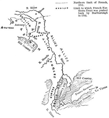 It is essential to a comprehension of the whole scheme to understand that before the march to the Danube the whole weight of the alliance against the French lay in the north, upon the frontier of Holland, the valley of the Meuse, and the Lower Rhine. The successes of Bavaria in the previous year had given the Bavarian army, with its French contingent, a firm grip upon the Upper Danube, and the possibility of marching upon Vienna itself when the campaign of 1704 should open.