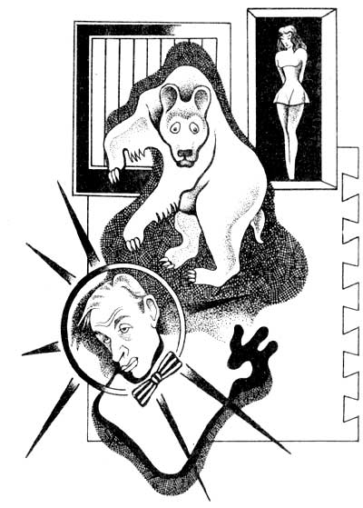 He was still alone an hour later—and still trying dizzily to separate fact from fancy, having tried the partition door and found it locked—when the bear returned to semi-consciousness and submitted groggily to a follow-up dosage of purgative.