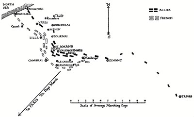Coburg, it was arranged, should be the General in practical command (under the nominal headship of the Emperor). Prussian troops, in excess of the twenty thousand which Prussia owed as a member of the Empire, were obtained upon the promise of a large subsidy from England and Holland, and with the month of April some 120,000 men were holding the line from Treves to[Pg 19] the sea. This passed through and occupied Dinant, Bavai, Valenciennes, St Amand, Denain, Tournai, Ypres, and Nieuport. To this number must be added men in the garrisons, perhaps some 40,000 more. Of this long line the strength lay in the centre.