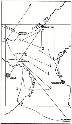 The time-table imposed upon the great plan by these delays is now apparent. The moment when all the strings of the net were to be pulled together round Souham was the space between midnight and dawn of Saturday the 17th of May. And the hour when all the six bodies of the allies were to join hands at “R” near Tourcoing was the noon of that day.