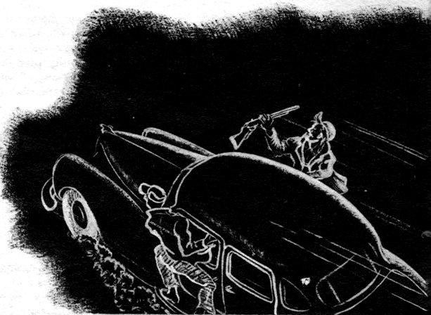There was a car before the bank with a reddish-haired man sitting in it. A haze came out of the exhaust, showing that the motor was running. None of this impressed Sam as remarkable. But as he looked, two other men came running out of the bank. One of them carried a bag and both of them had revolvers out and they piled into the car and the reddish-haired man gunned it and it was abruptly a dwindling speck in a cloud of dust, getting out of town.