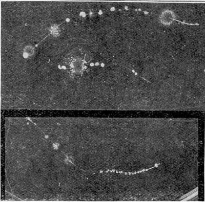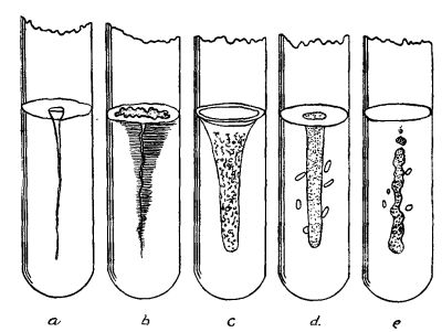 Fig. 5.—Different Kinds of Bacteria Growing in Gelatin.These culture methods are of essential importance in[Pg 26] bacteriology, as it is the only way in which it is possible to secure a quantity of germs in a pure state.