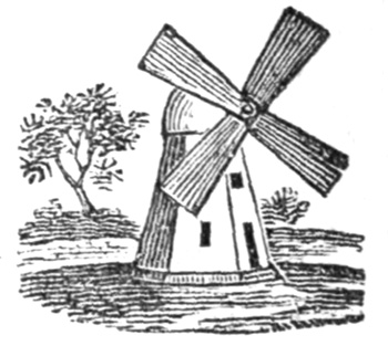 The Wind-Mill has sails fixed to very long poles, and when the wind [5]blows strong, round go the wings. As the wings blow round, they carry round a large stone inside the house; this stone rubs on top of another mill-stone, and corn is put between them, which is thus broken and ground into meal. We cannot eat corn till it is ground; but horses can. Some mill-stones are likewise carried round by a stream of running water, and some by the steam of boiling water. There are a number of [6]water-mills on the Mill-dam which leads from Boston to Roxbury.